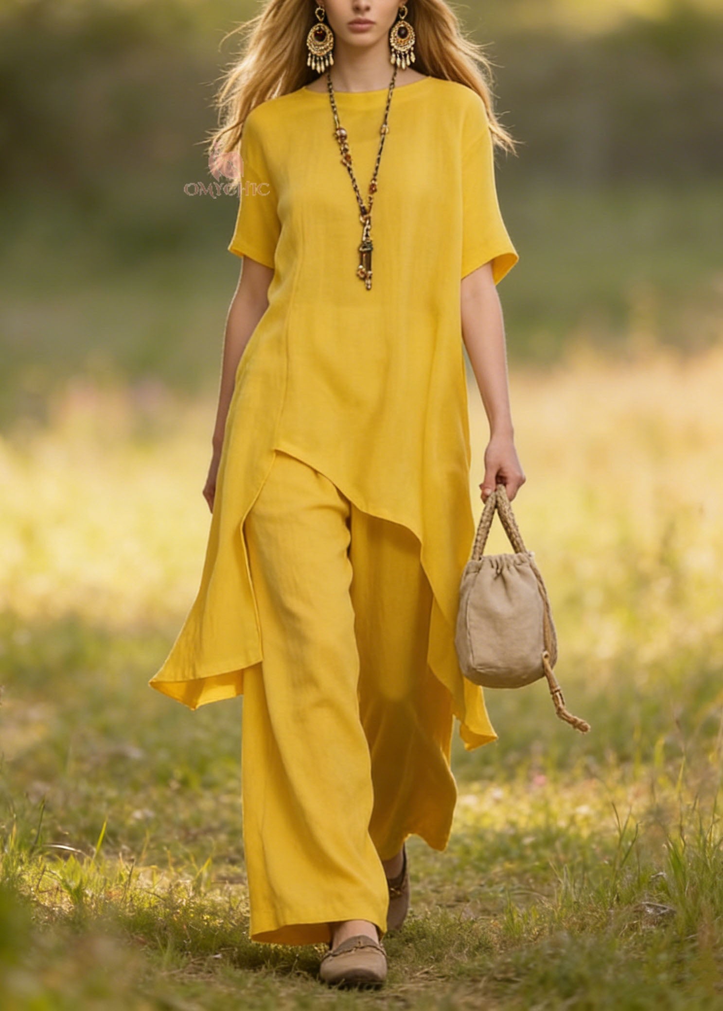 Casual Yellow Asymmetrical Plus Size Cotton Women Sets 2 Pieces Summer