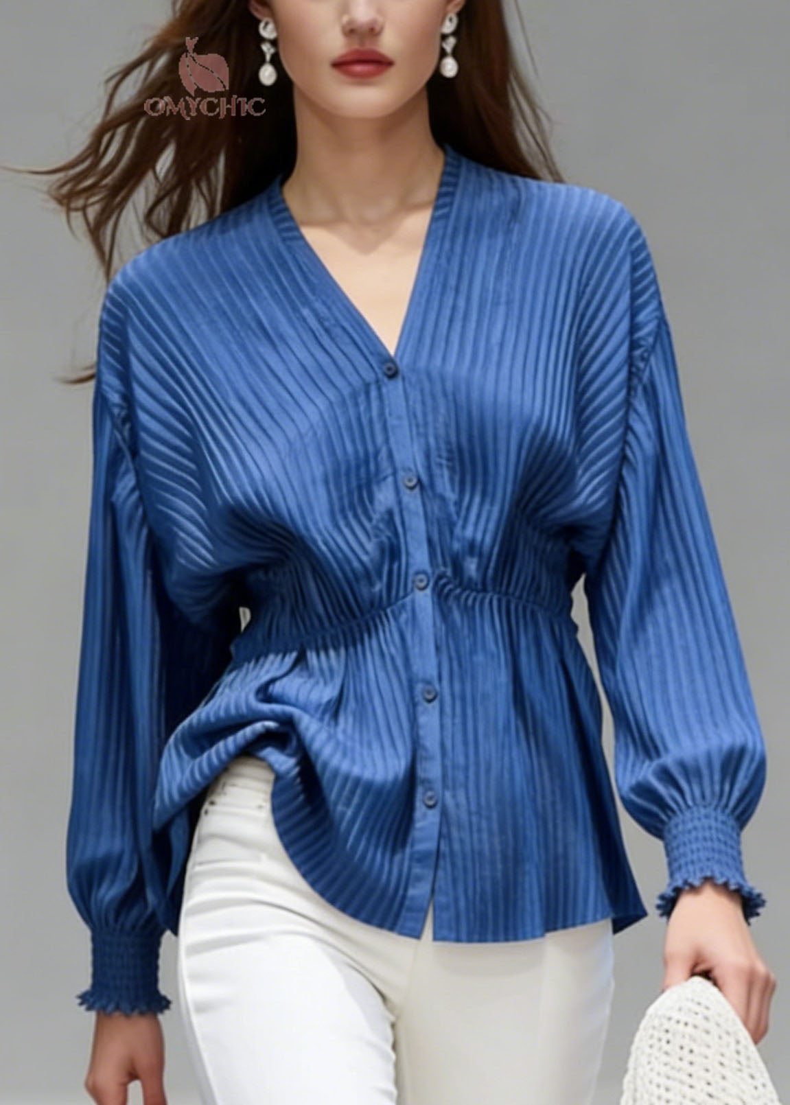 Classy Blue V Neck Button Patchwork Cotton Shirts Top Spring