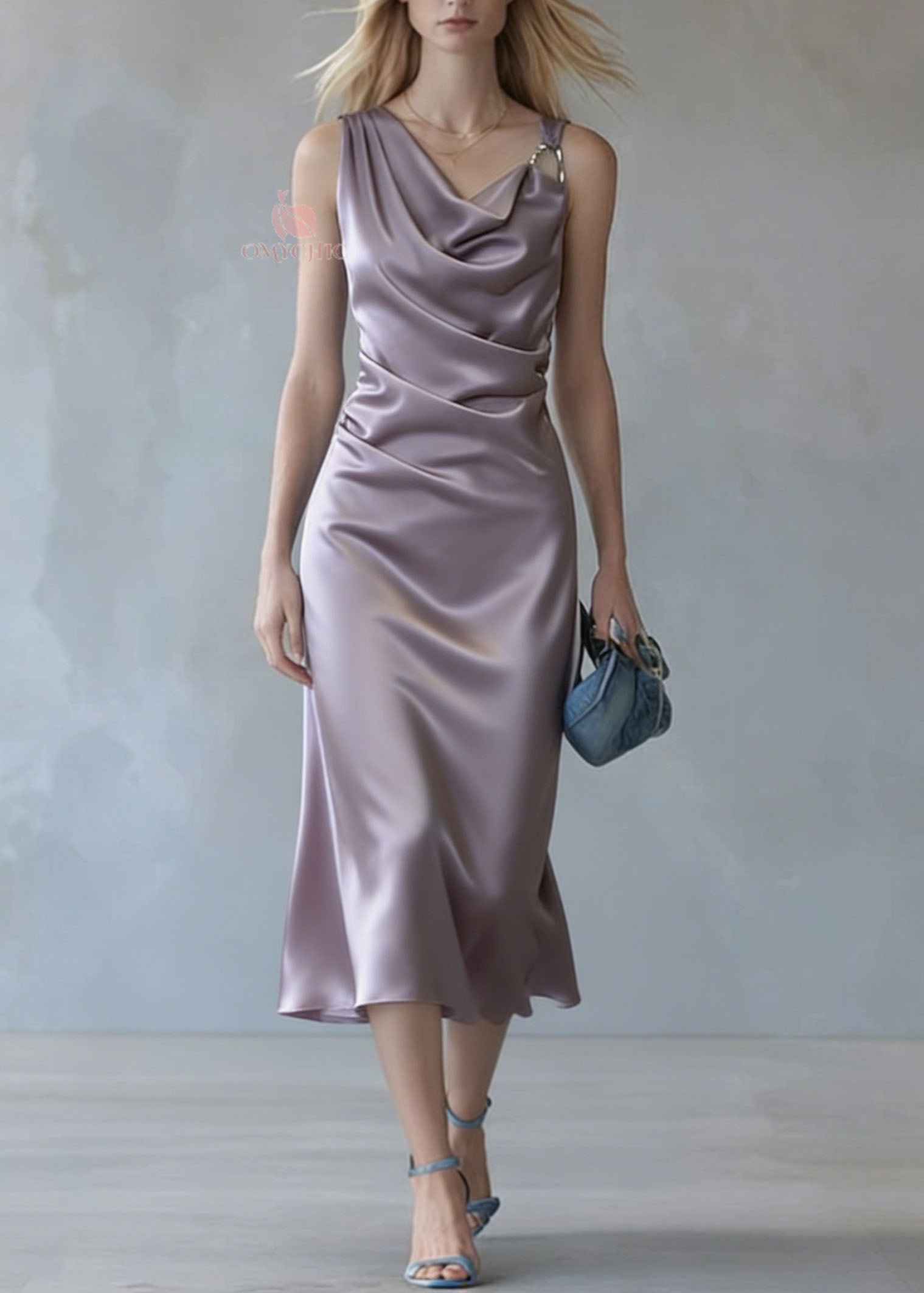 Elegant Purple Wrinkled Silk Spaghetti Strap Dress Summer
