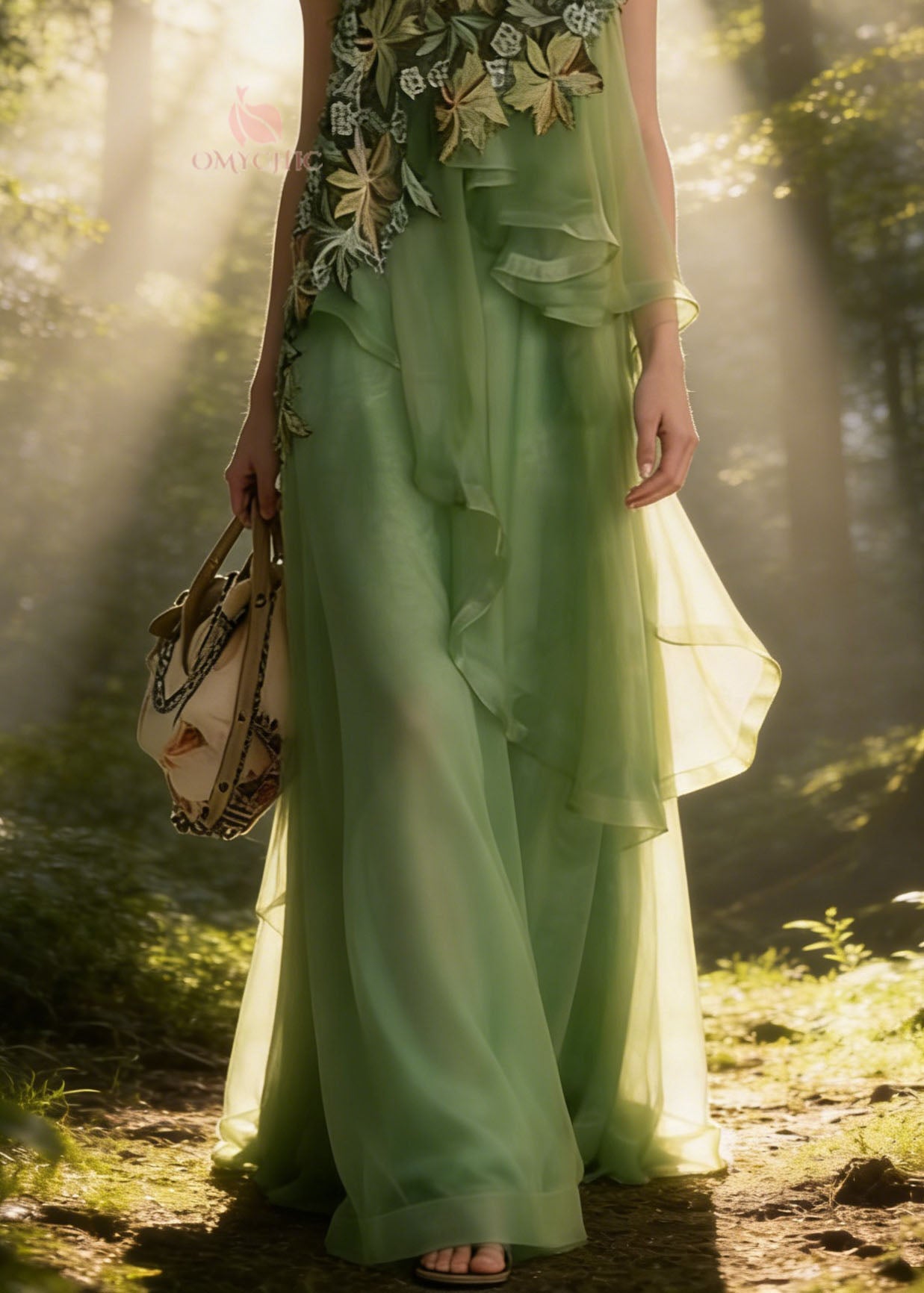 Fashion Green Asymmetrical Patchwork Tulle Spaghetti Strap Dress Summer
