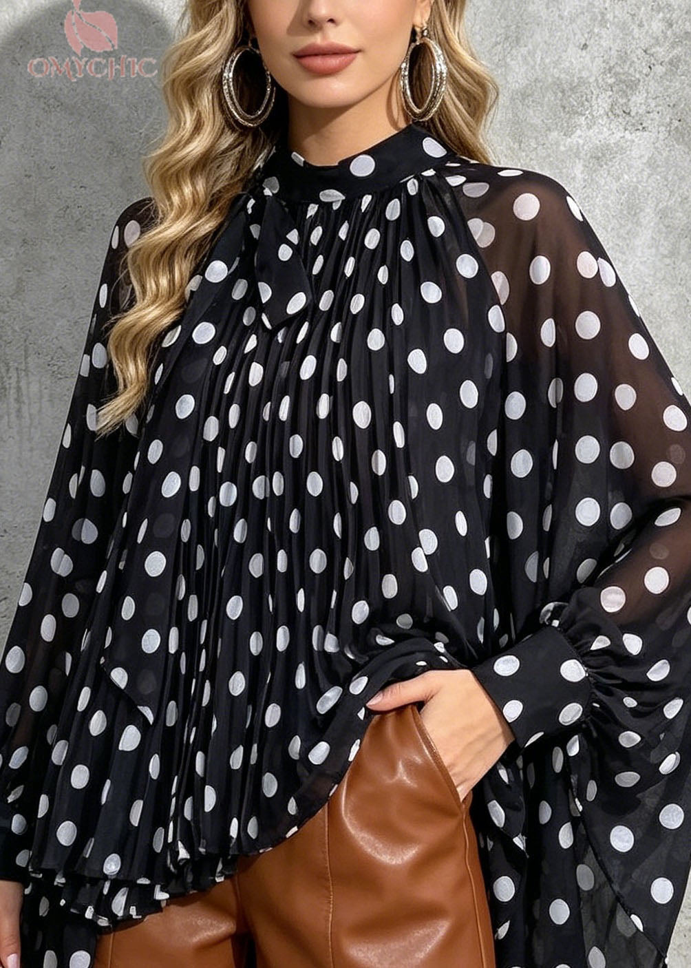 New Loose Black Dot Print Bow Chiffon Shirt Batwing Sleeve