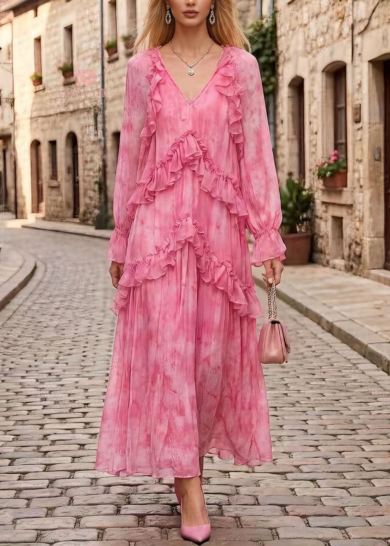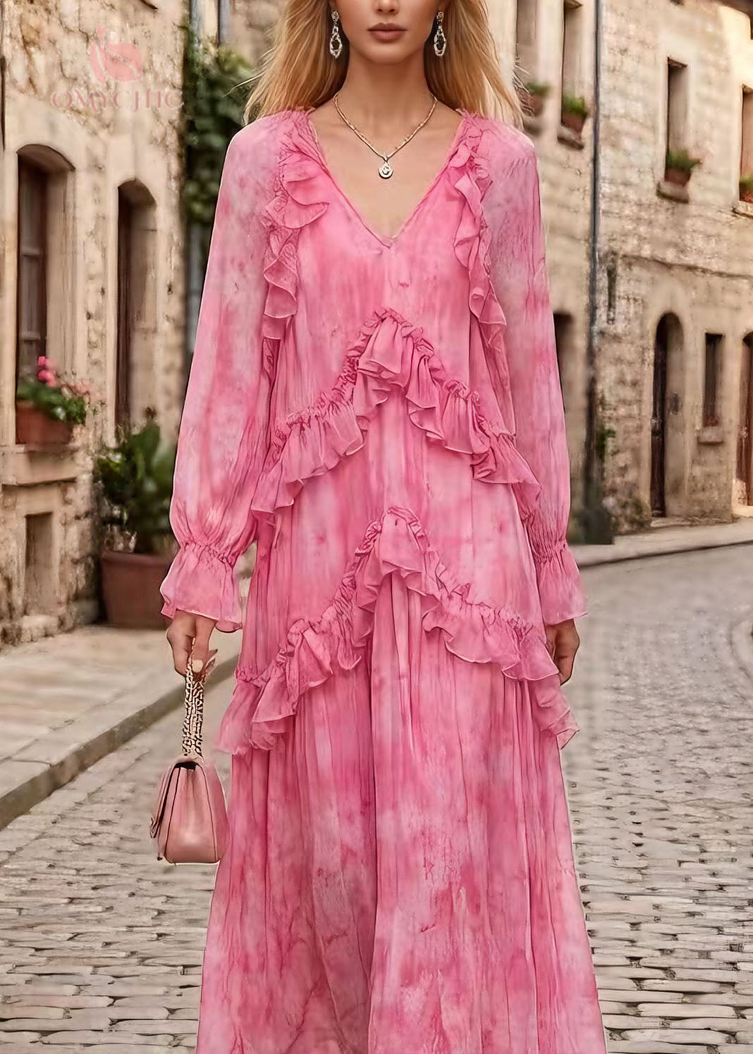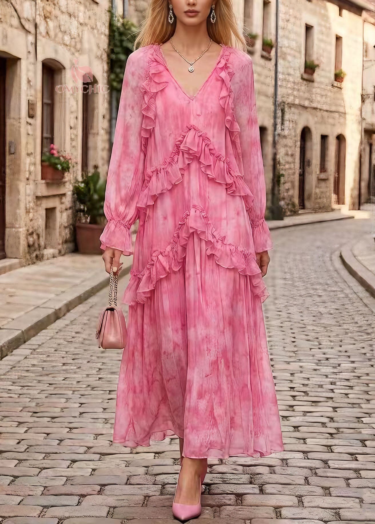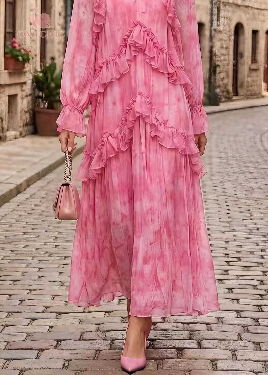 French Pink Ruffled Patchwork Chiffon Maxi Dresses Summer