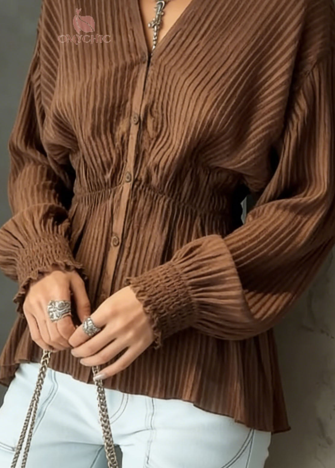 Unique Brown V Neck Button Wrinkled Cotton Shirt Spring