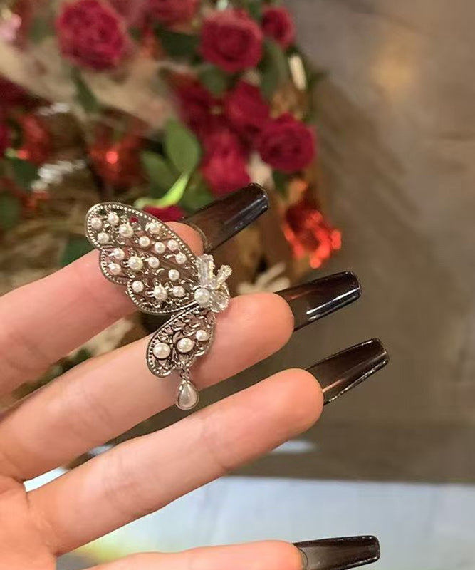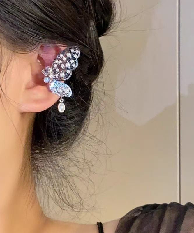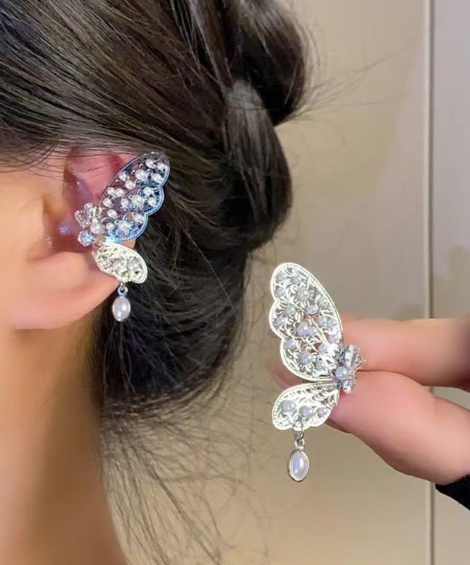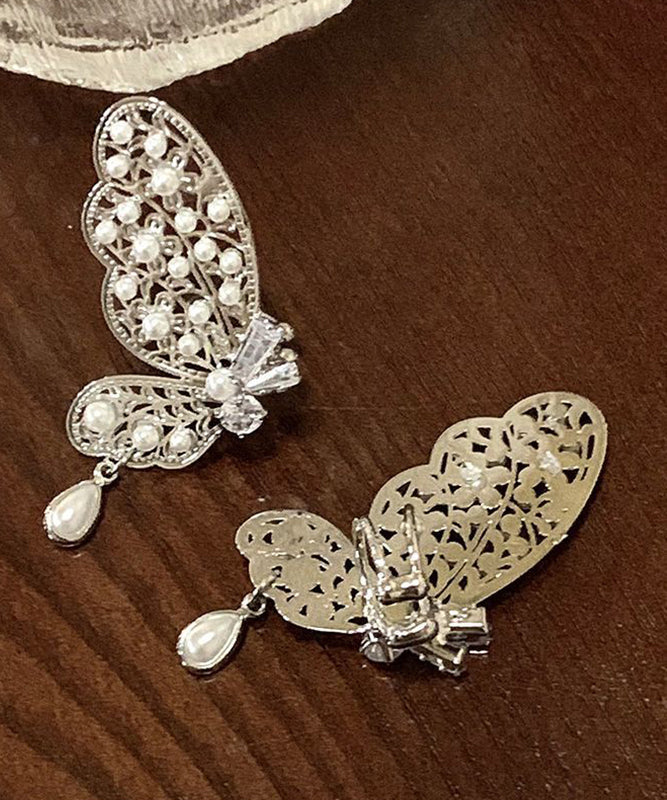 Original Design Silk Copper Overgild Zircon Pearl Hollow Out Butterfly Stud Earrings