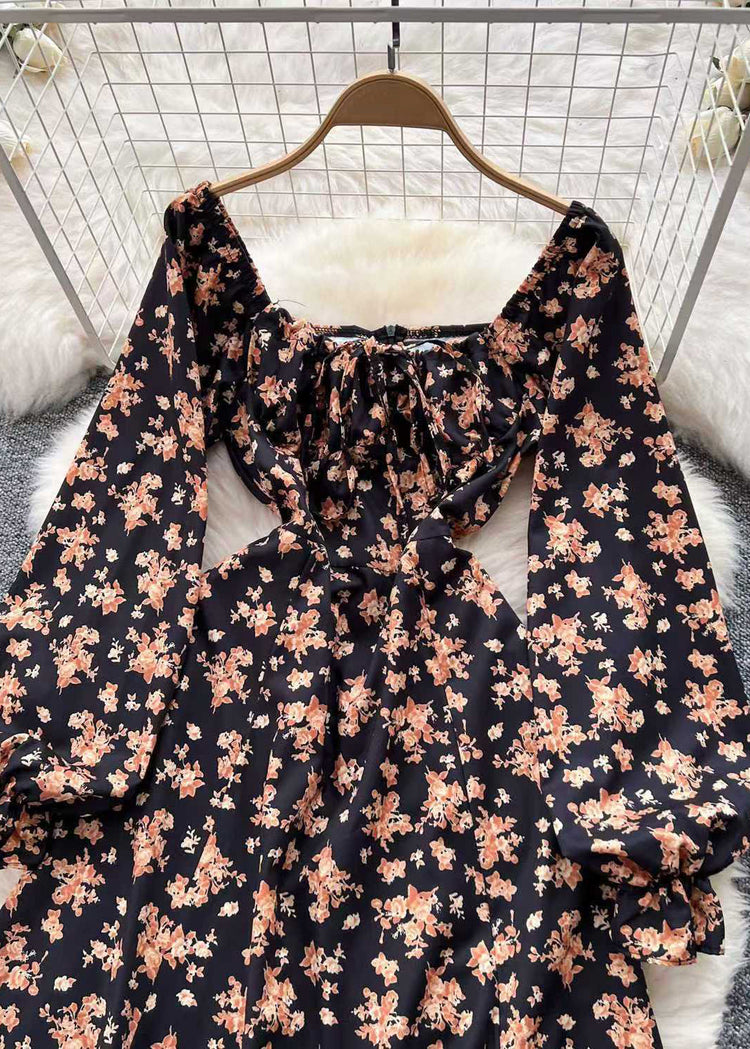 Bohemian Black Square Collar Print Side Open Cotton Dress Fall