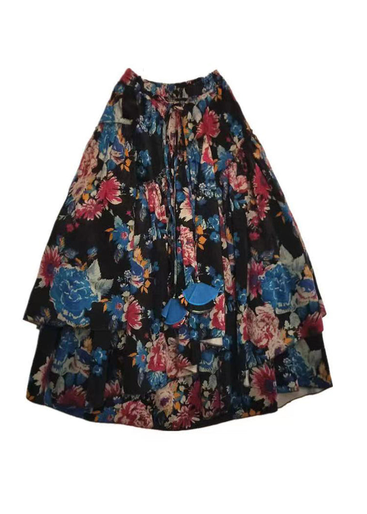 Bohemian Black Wrinkled Asymmetrical Print Cotton Skirts Spring