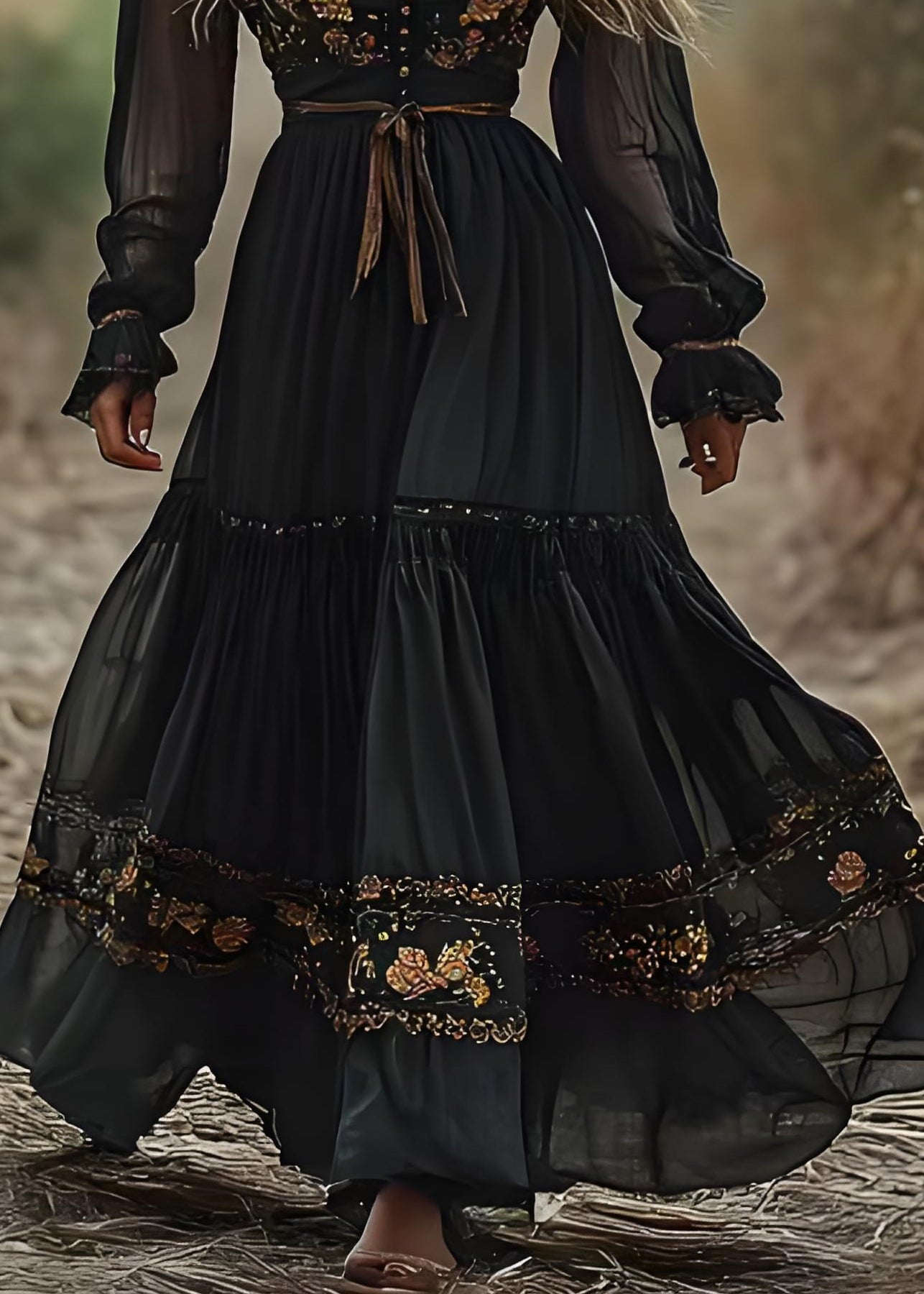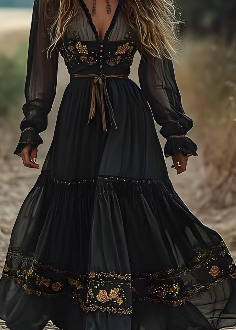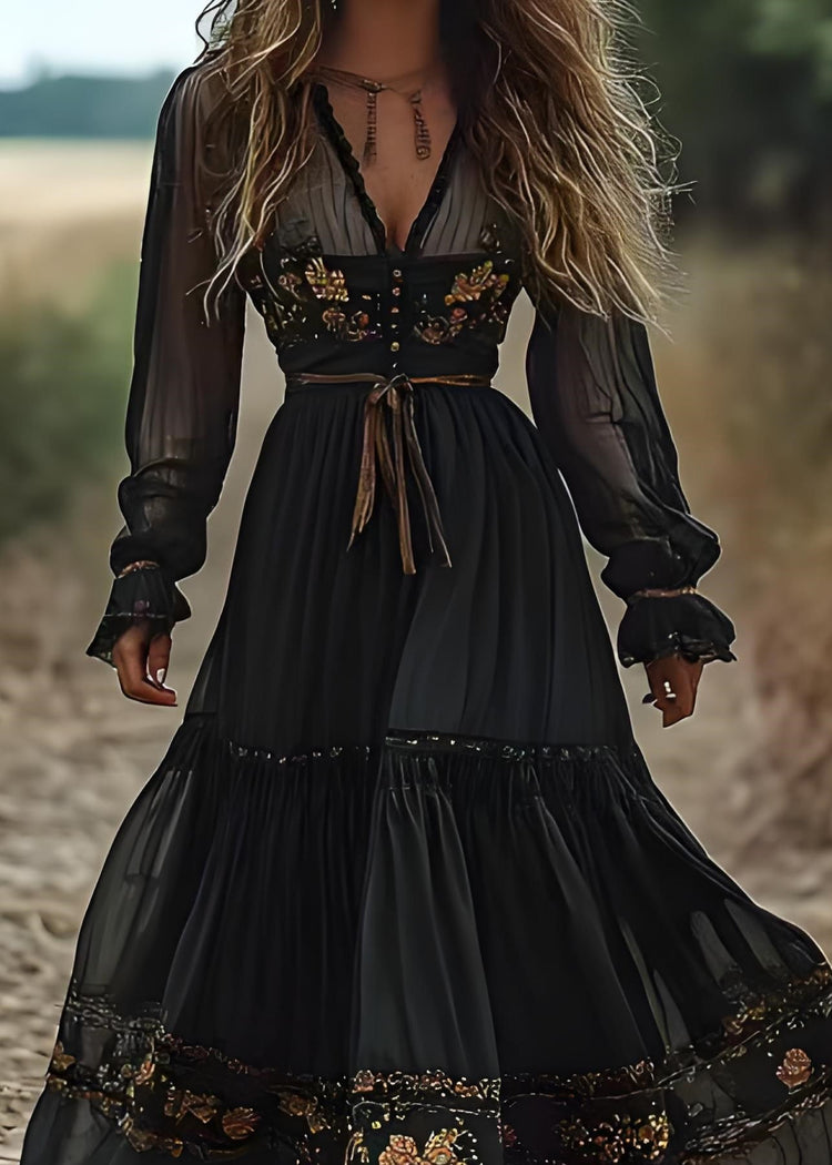 Bohemian Blackish Green V Neck Wrinkled Patchwork Cotton Long Dress Spring