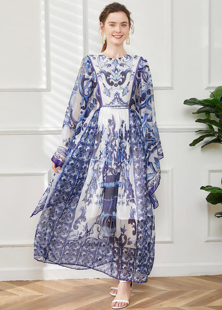 Bohemian Blue O-Neck Print Chiffon Maxi Dress Cloak Sleeves