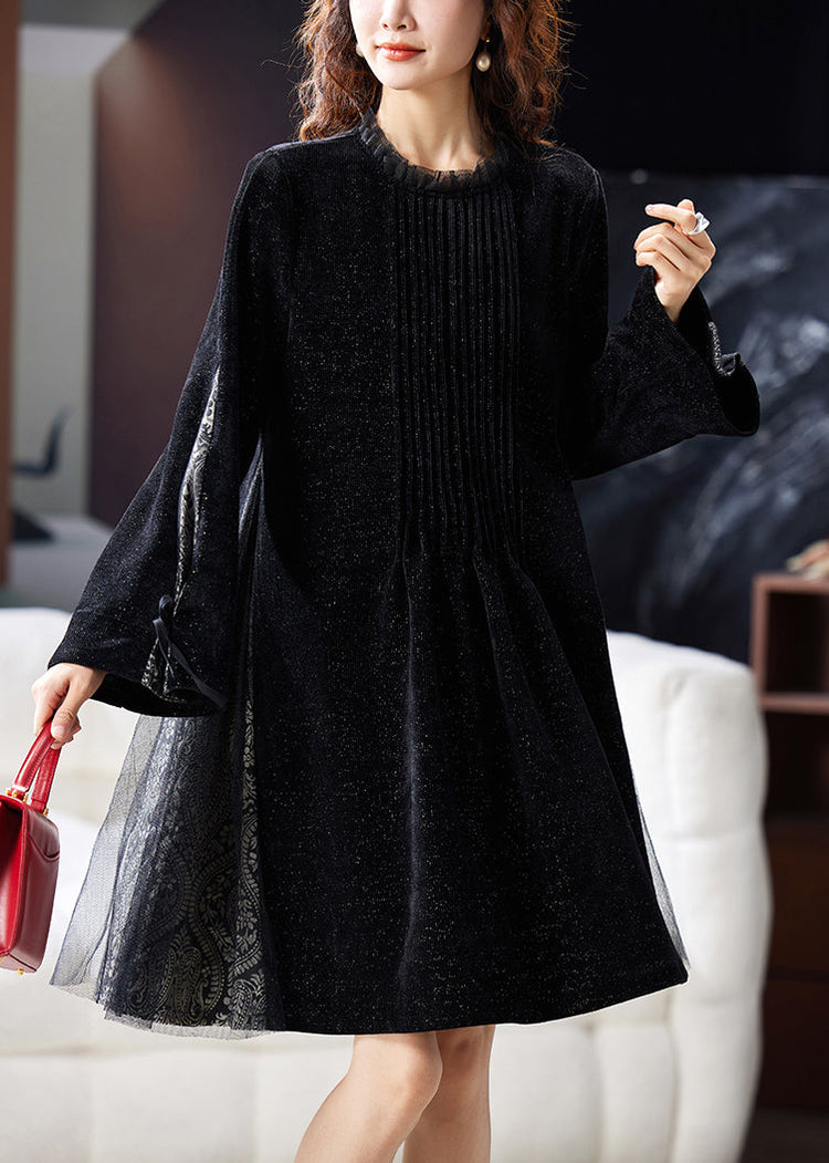 French Black Ruffled Tulle Patchwork Mid Dress Flare Sleeve