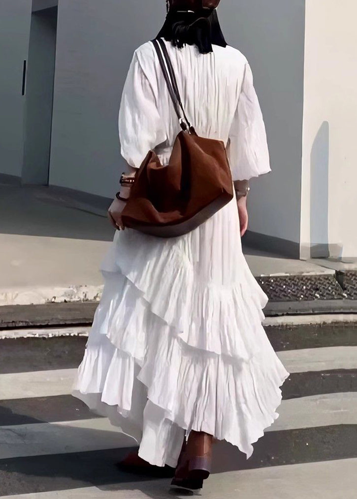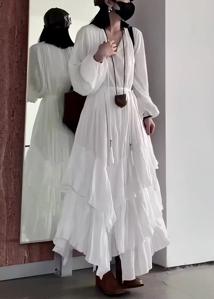 French Black V Neck Wrinkled Solid Cotton Long Dress Fall