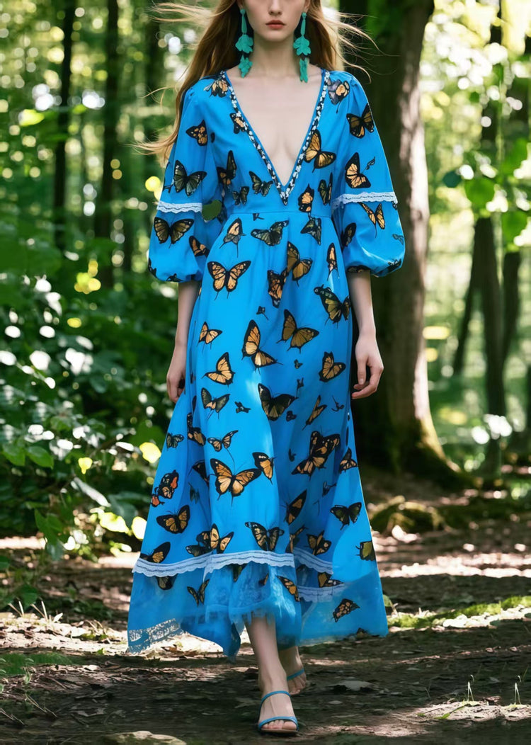 French Blue Deep-V Neck Print Cotton Long Dresses Lantern Sleeve