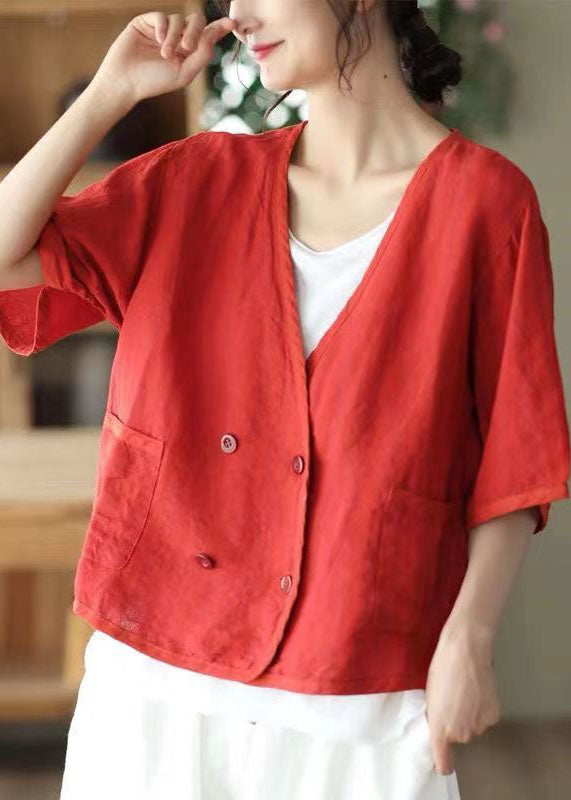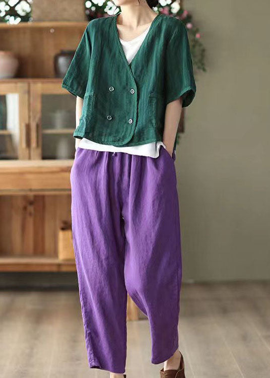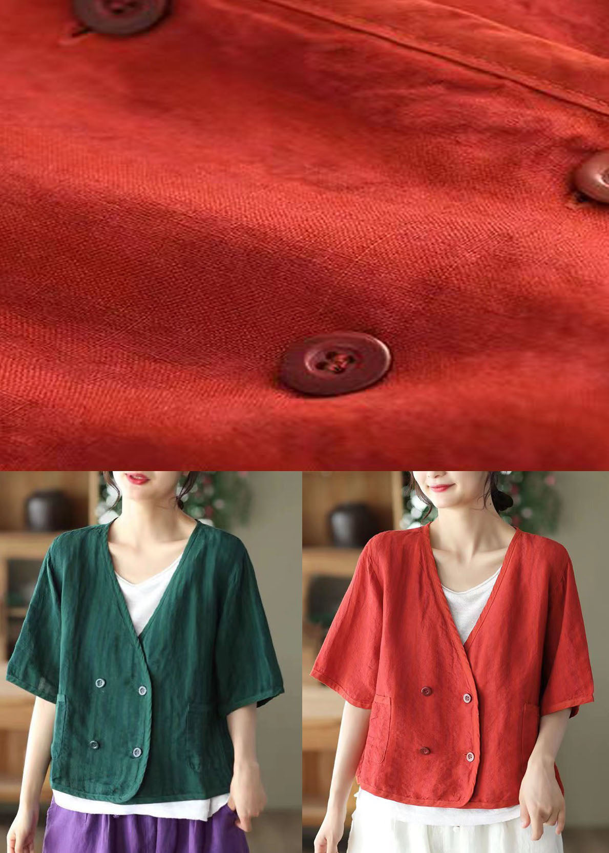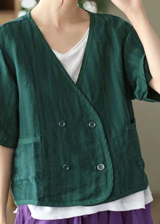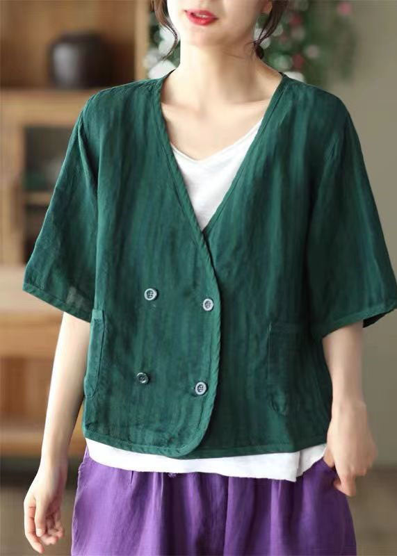 Green Pockets Patchwork Linen Cardigan V Neck Summer