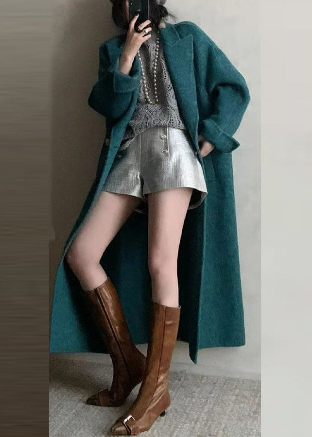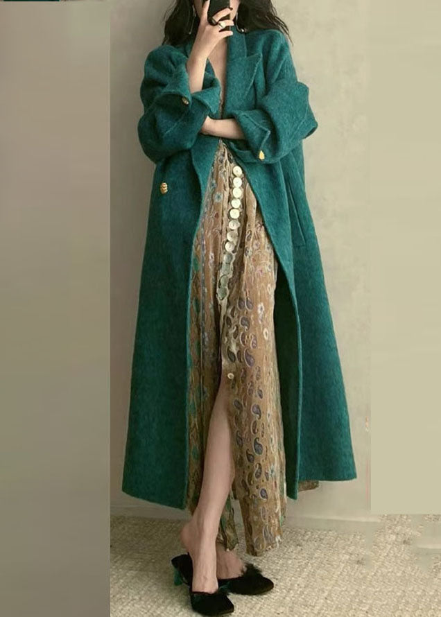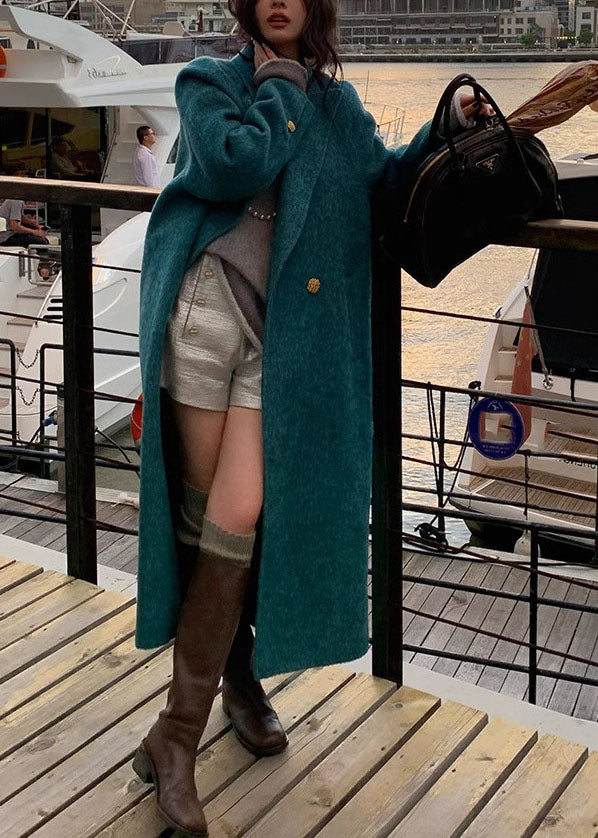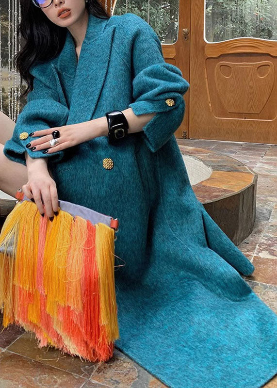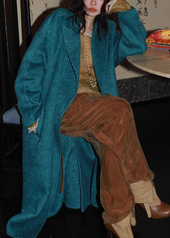 Bohemian Peacock Blue Notched Pockets Woolen Maxi Coats Long Sleeve
