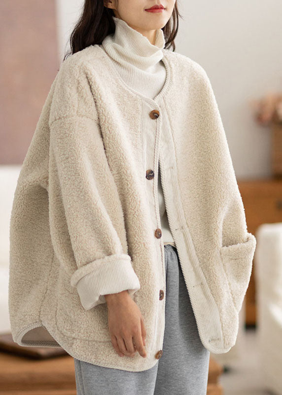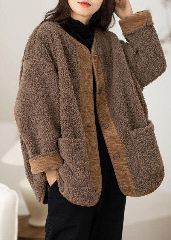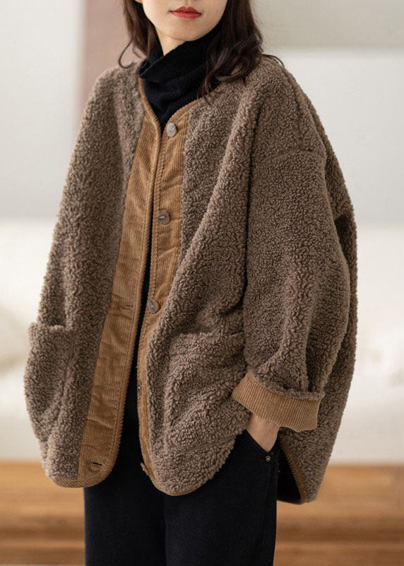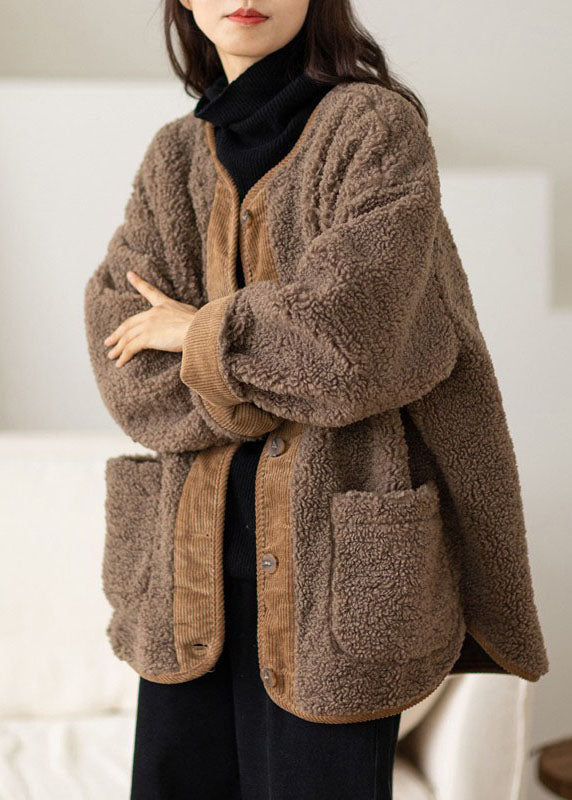 Casual Coffee O-Neck Pockets Button Warm Faux Fur Coats Long Sleeve