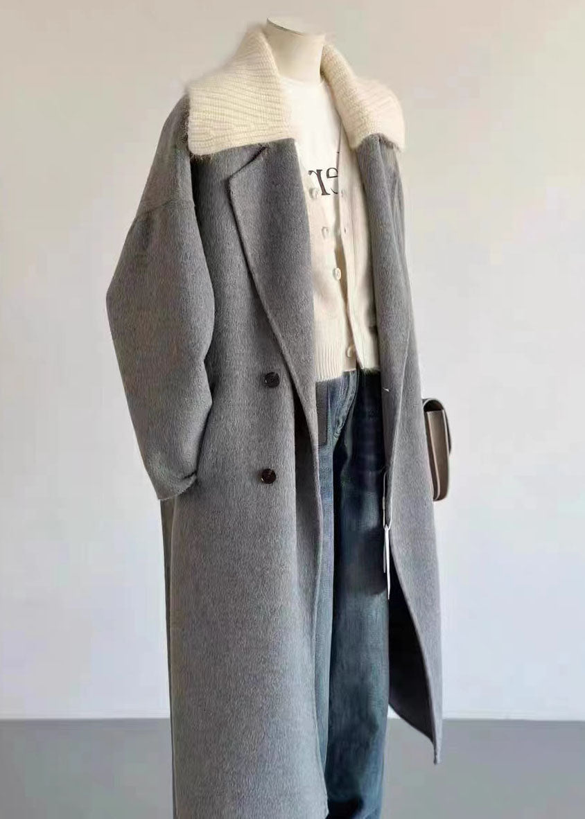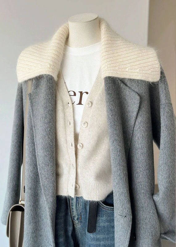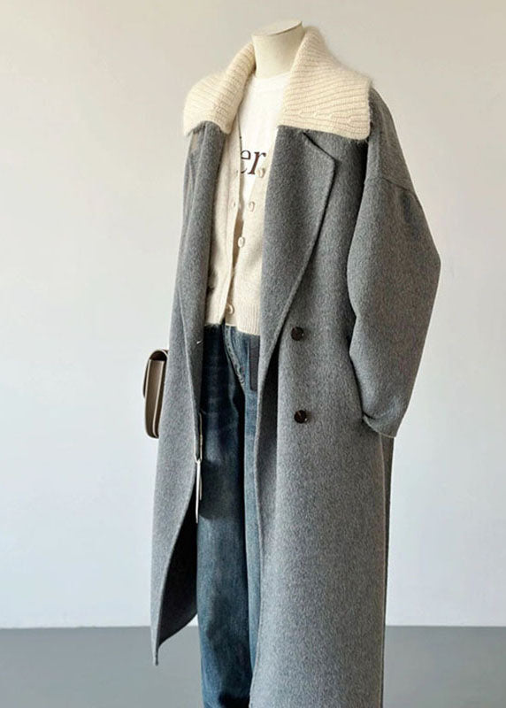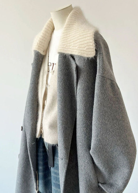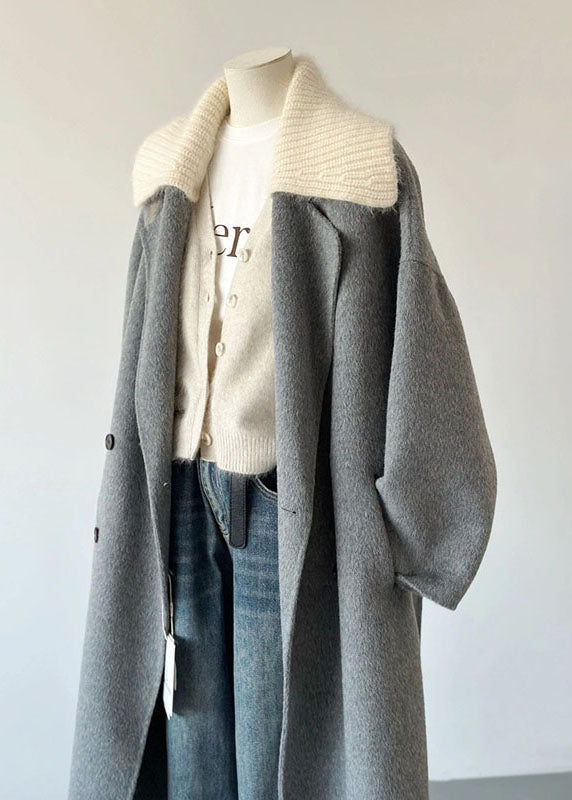 Elegant Grey Peter Pan Collar Pockets Knit Patchwork Woolen Long Coats Long Sleeve