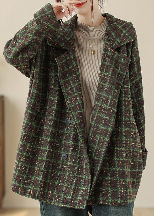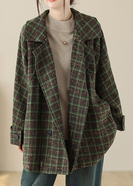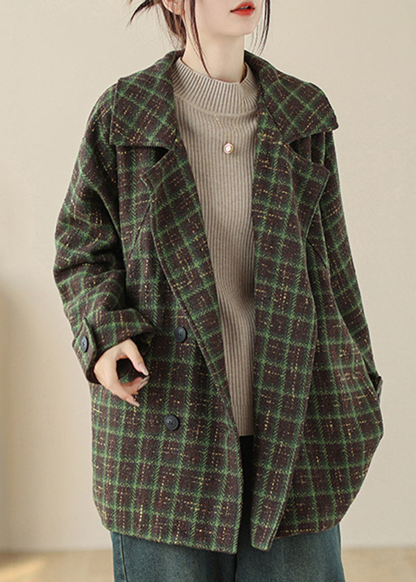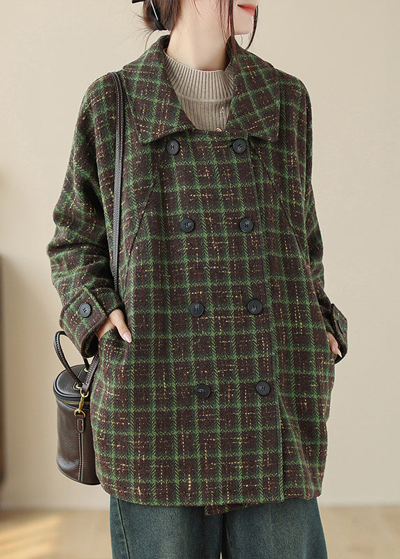 Green Pockets Plaid Woolen Coat Peter Pan Collar Double Breast Fall
