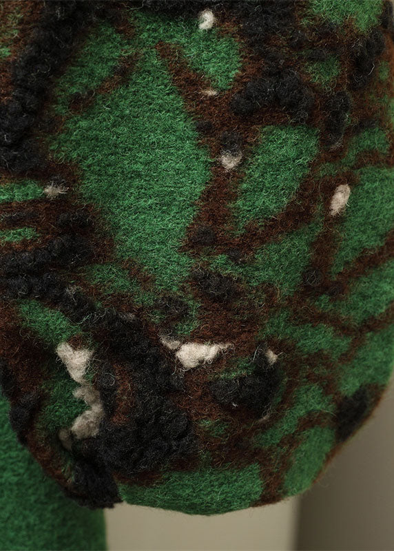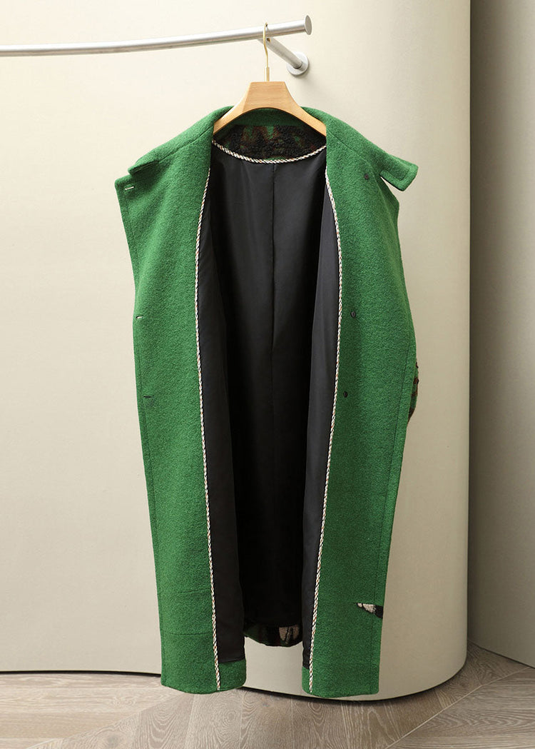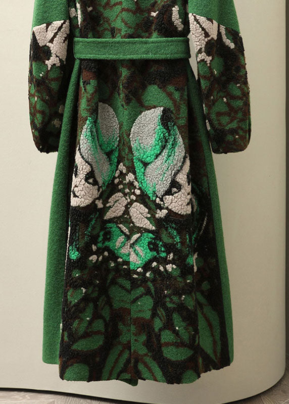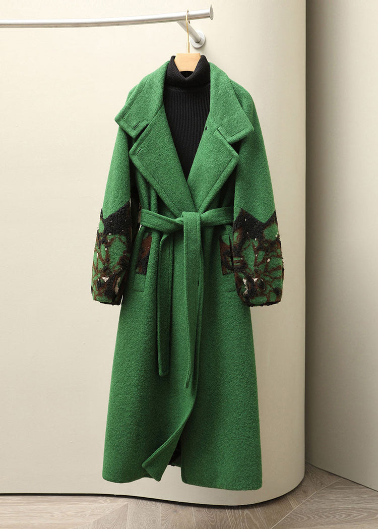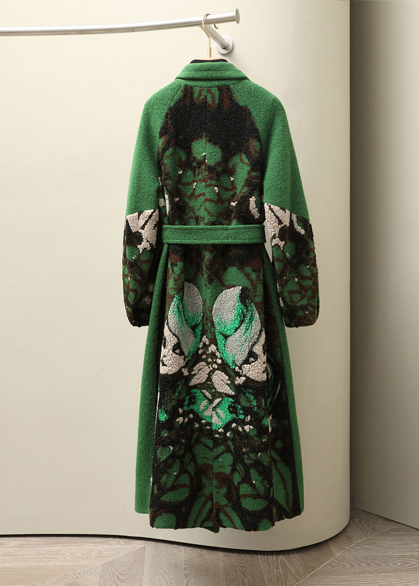 Jacquard Green Notched Tie Waist Woolen Long Coats Fall