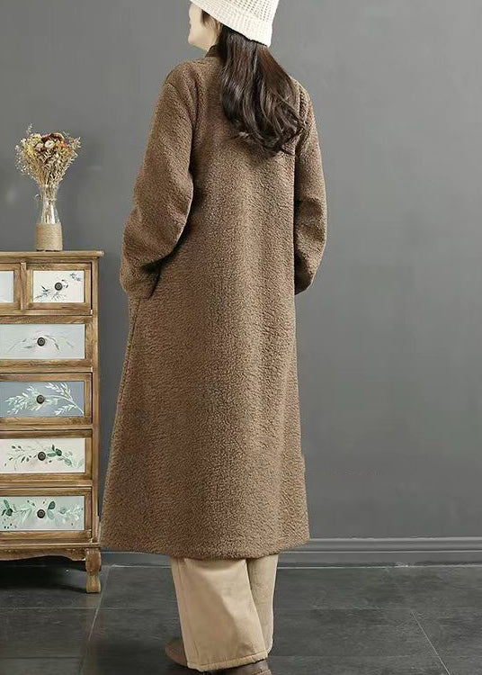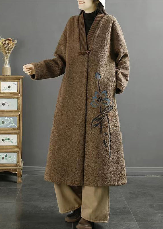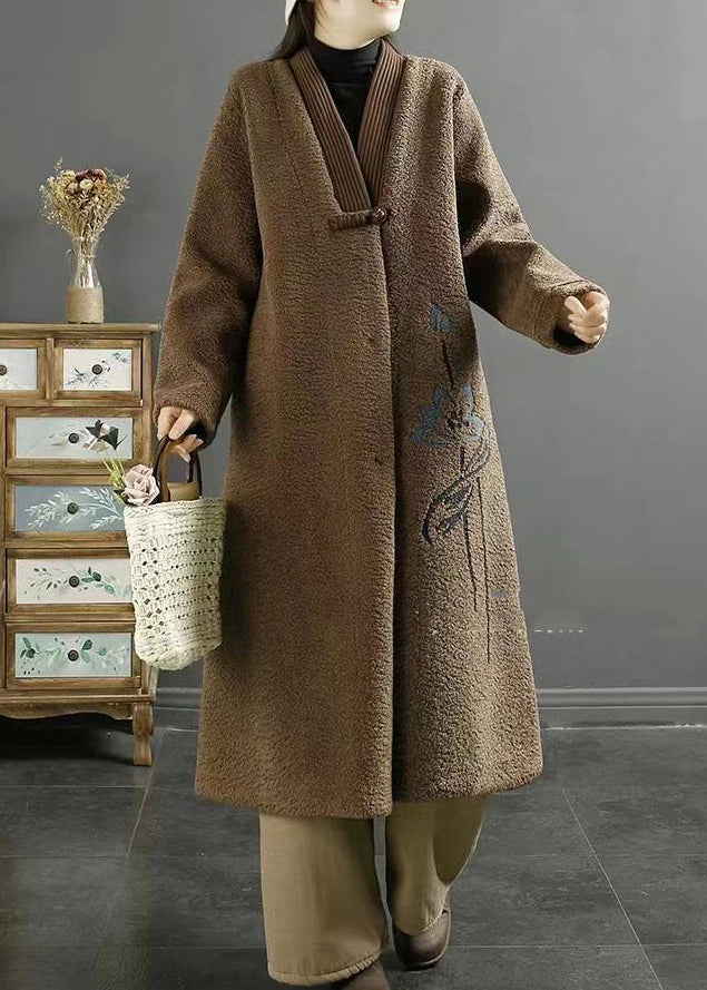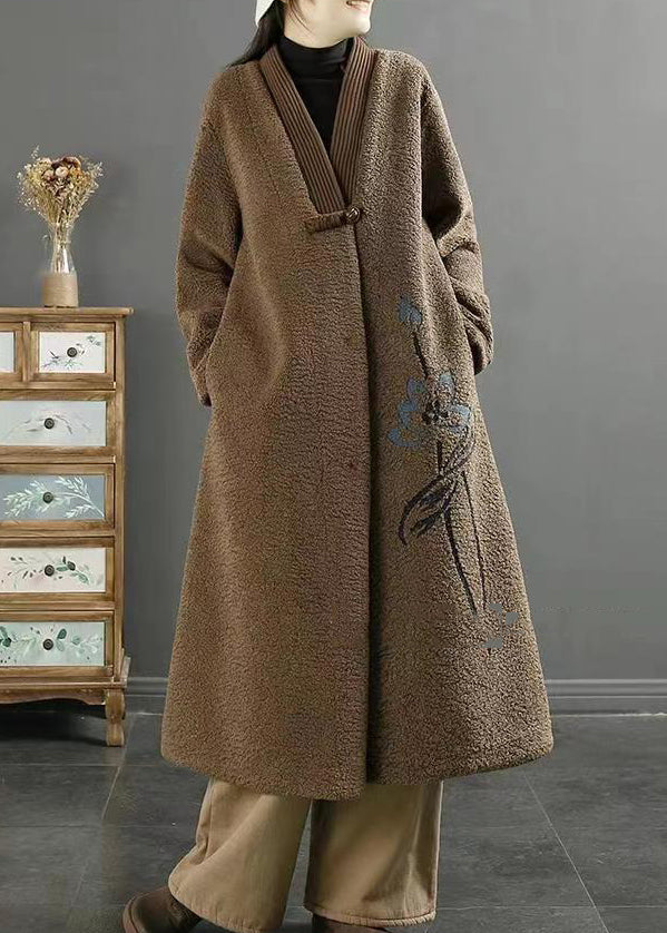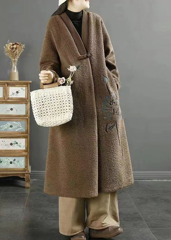 Plus Size Chocolate Embroideried Chinese Button Faux Fur Coats Winter