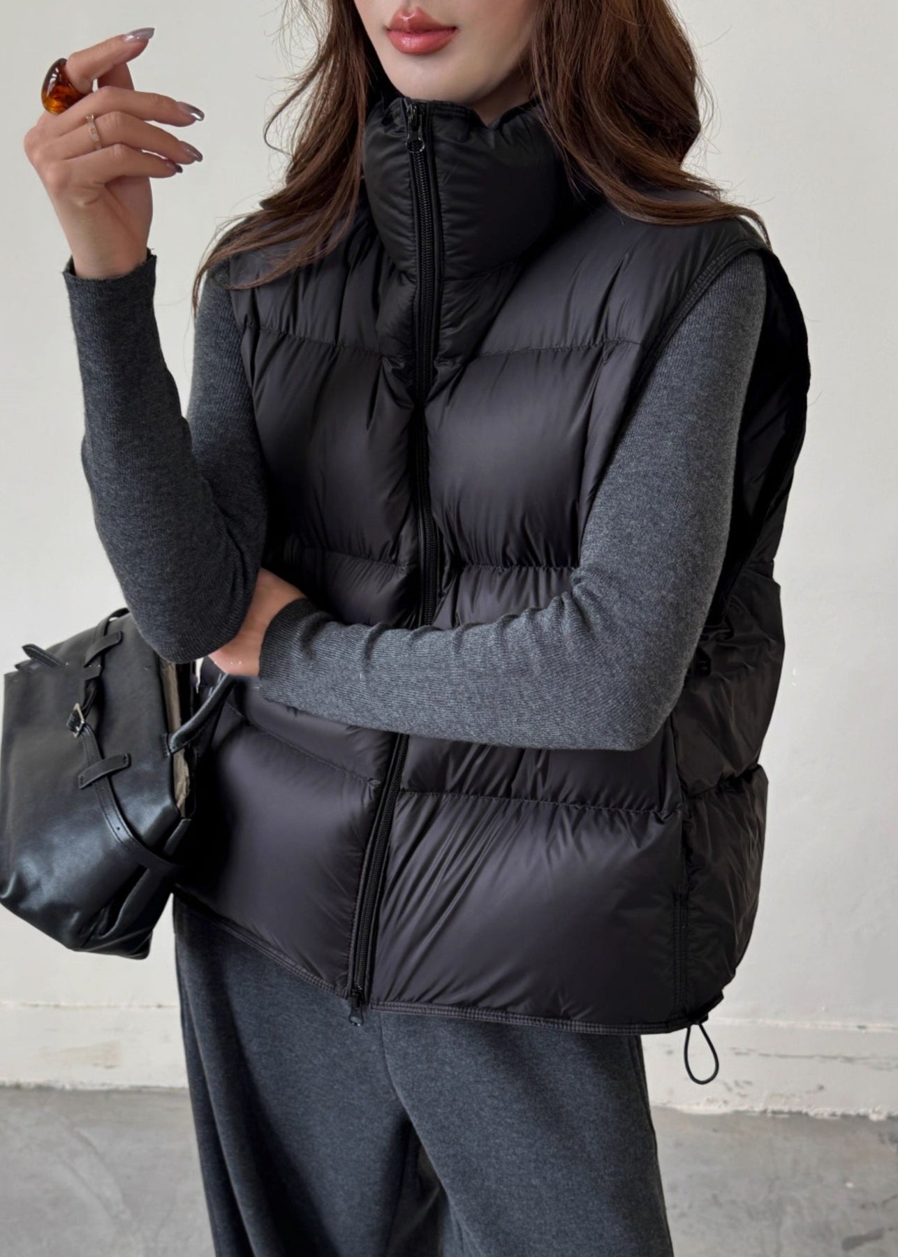 Black Drawstring Solid Duck Down Winter Waistcoat Zip Up