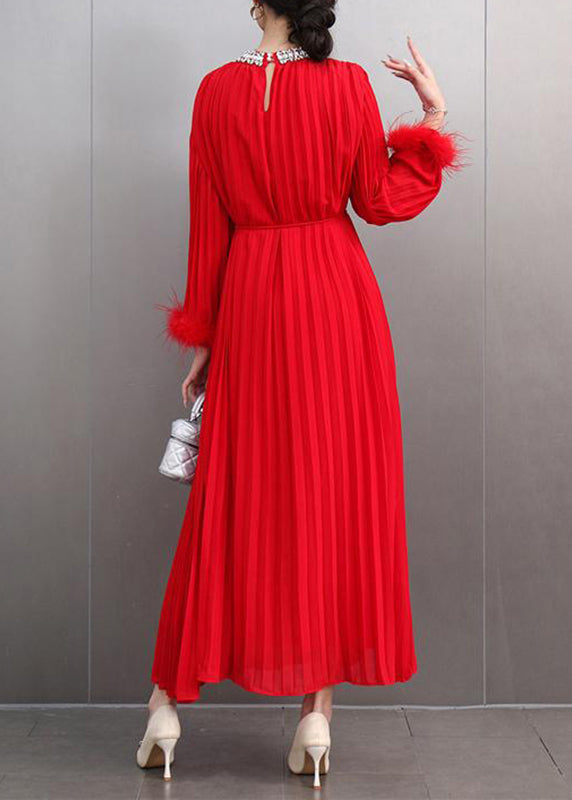 Italian Red O-Neck Wrinkled Patchwork Zircon Maxi Dresses Spring