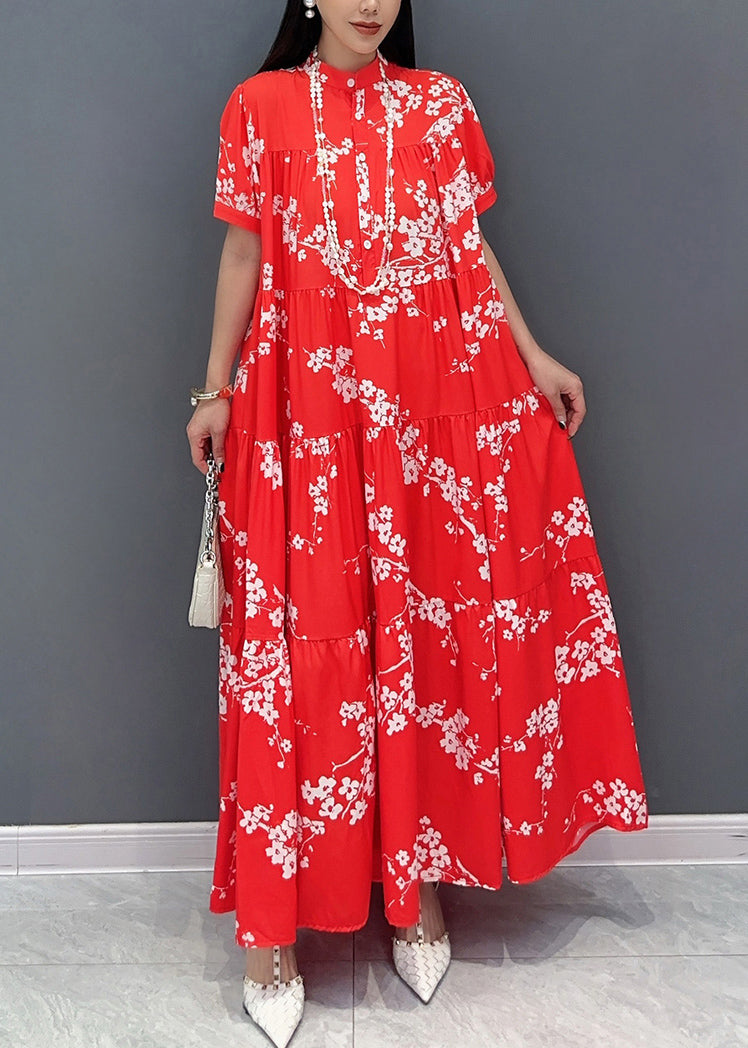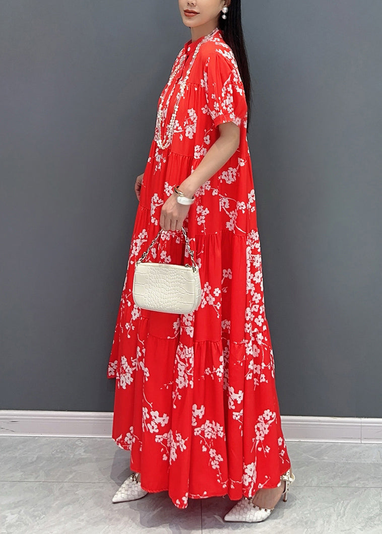 Loose Red Stand Collar Print Patchwork Long Dresses Summer