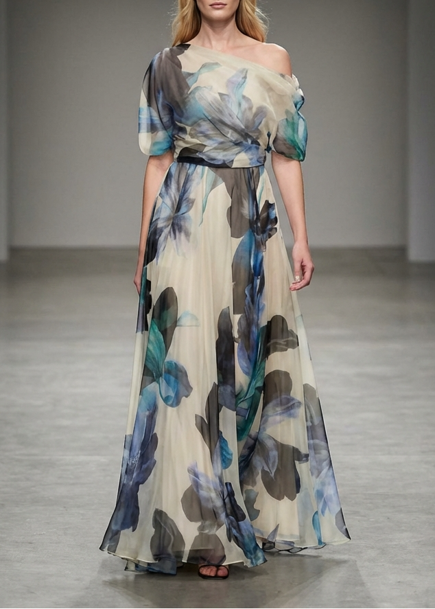 French Sky Blue Asymmetrical Print Chiffon Long Dresses Summer