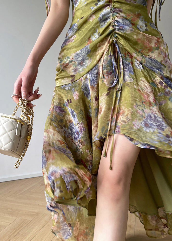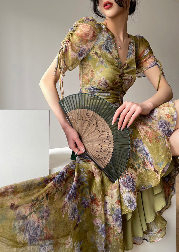 Slim Fit V Neck Zippered Print Drawstring Chiffon Dress Short Sleeve