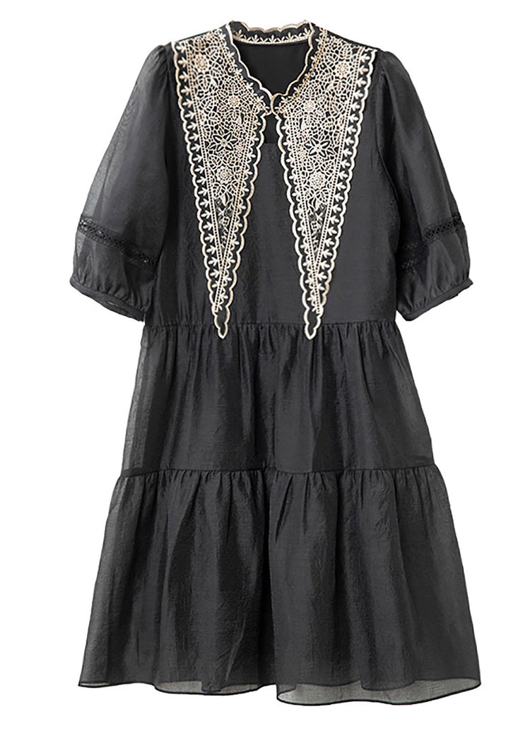 Women Black Patchwork Cotton Mid Dress Puff Sleeve