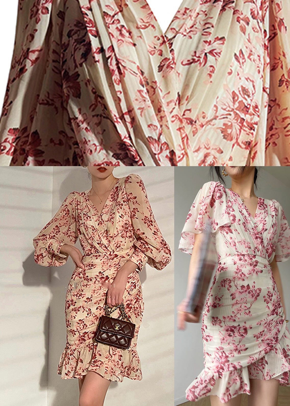 French V Neck Asymmetrical Print Chiffon Mid Dress Long Sleeve