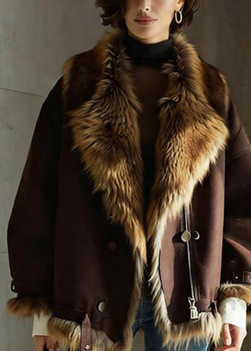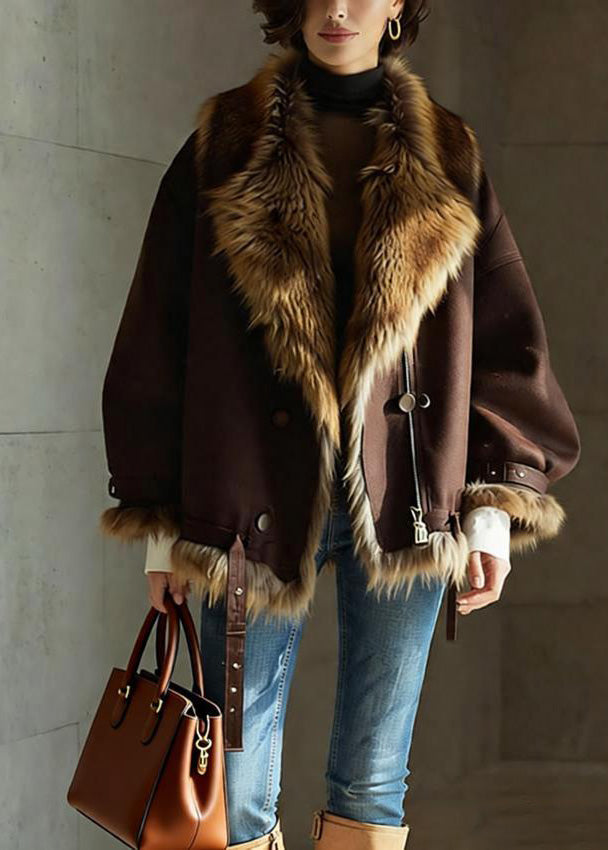 Chic Brown Pockets Button Faux Fur Jackets Winter
