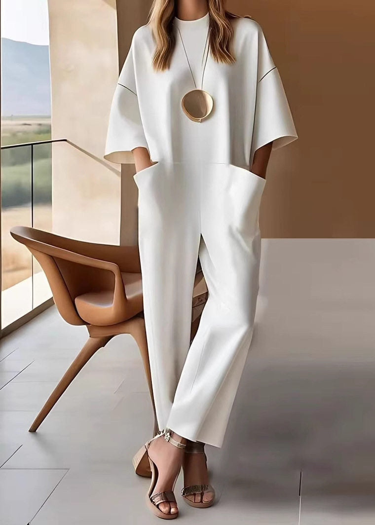 Style White O-Neck Patchwork Pockets Jumpsuits Half Sleeve