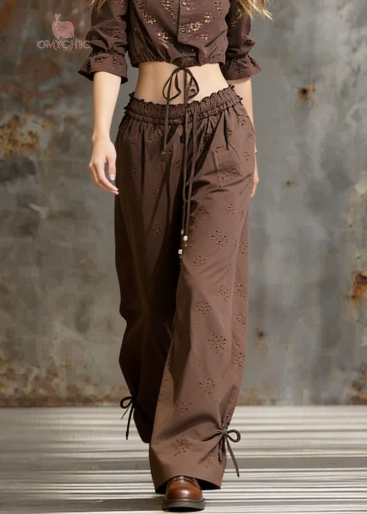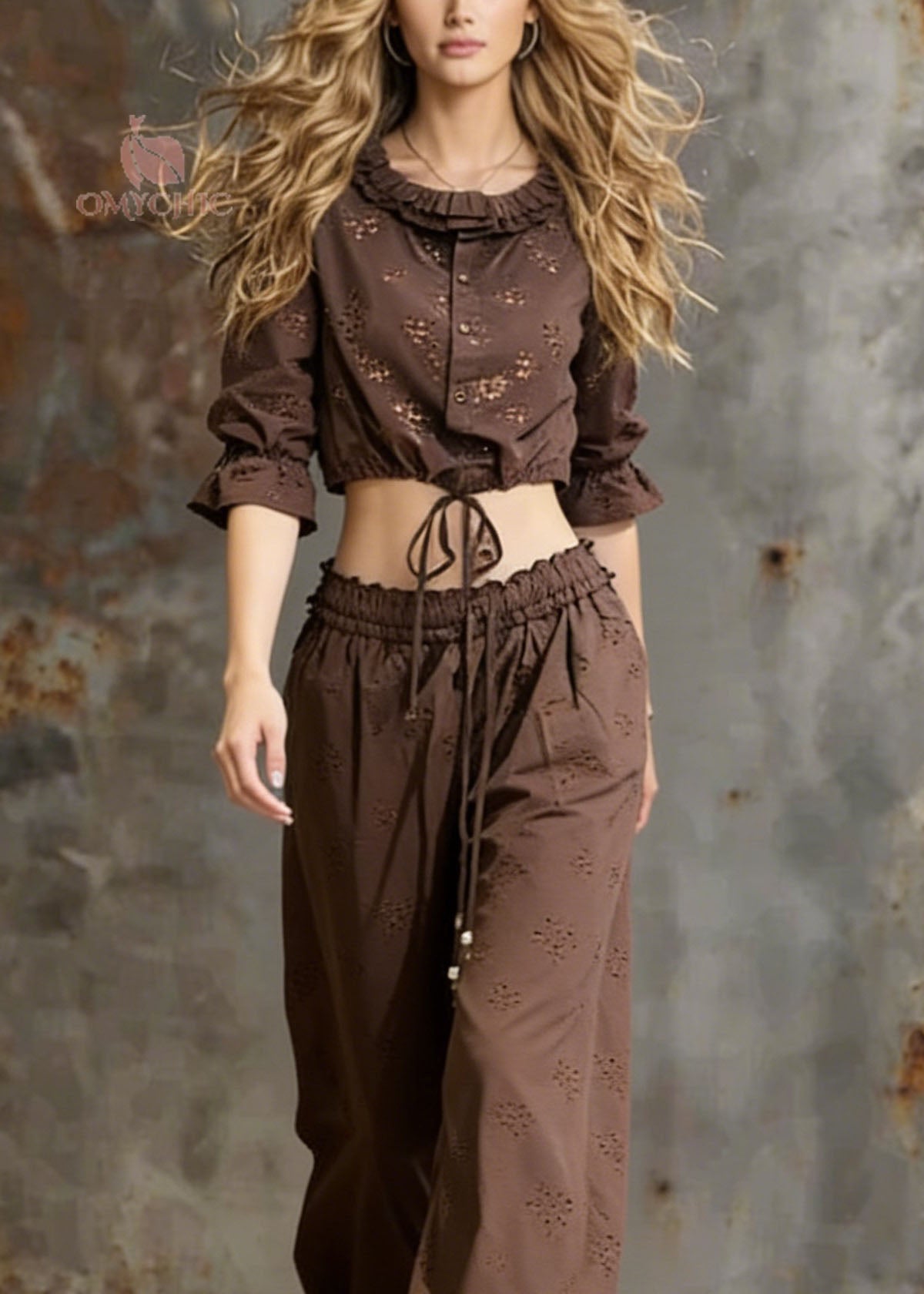 Fashion Coffee Lace Up Ruffled Cotton Two Pieces Set Spring