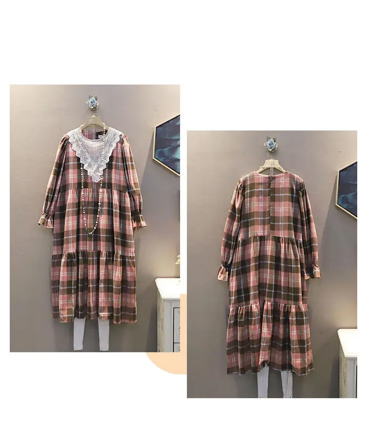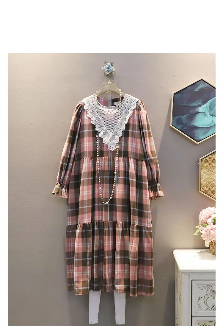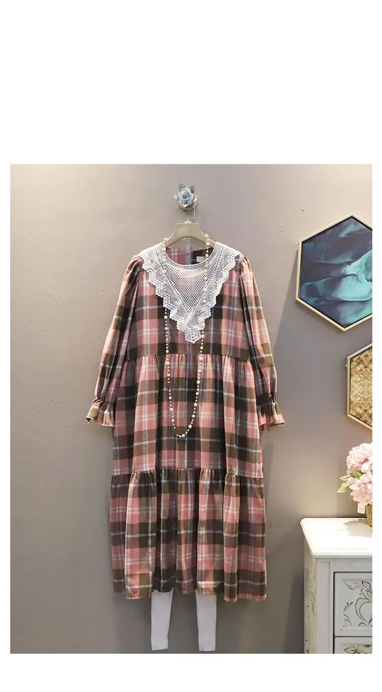 New Plaid Dress Hollow Out Lace Patchwork Women Casual Spring Fashion O Neck Collar Pullover
