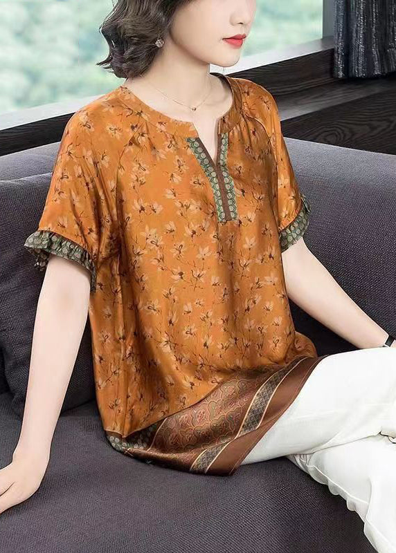 Loose Orange V Neck Print Side Open Patchwork Silk T Shirts Summer