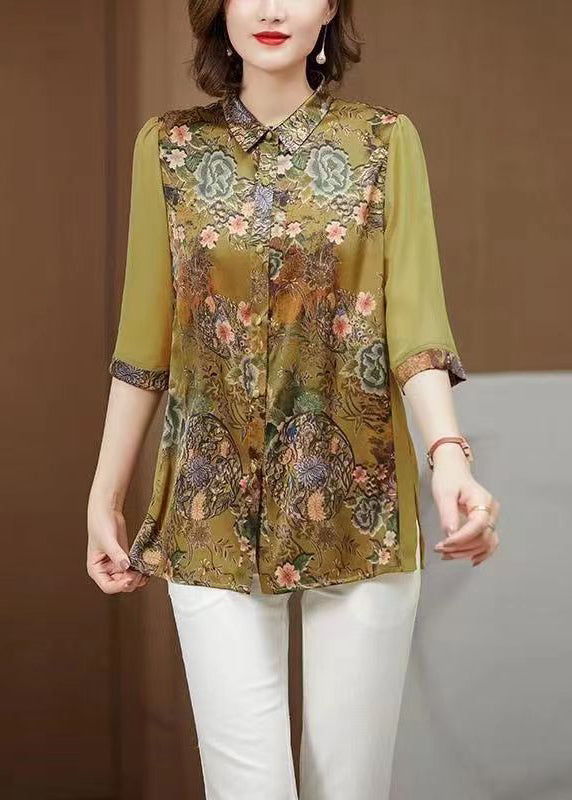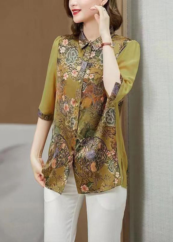 Loose Green Peter Pan Collar Print Silk Blouses Half Sleeve