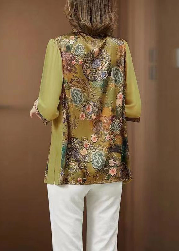 Jacquard Yellow Stand Collar Patchwork Button Silk Shirt Long Sleeve