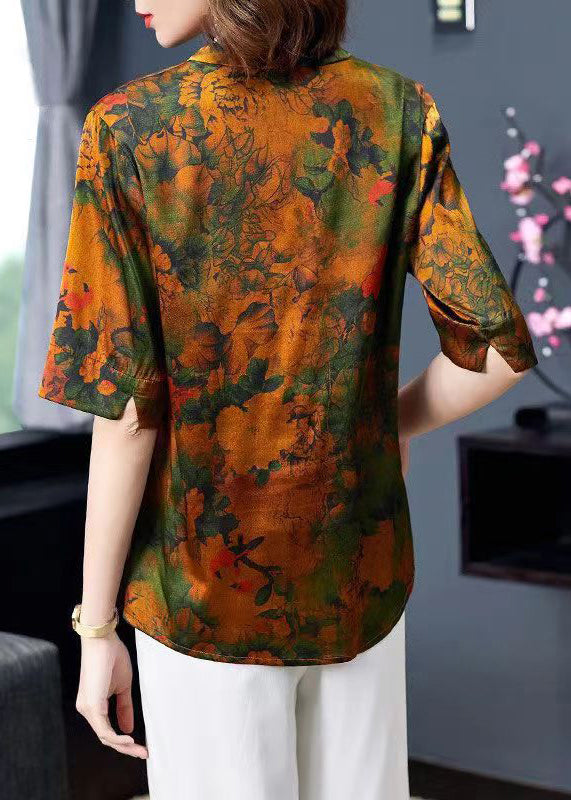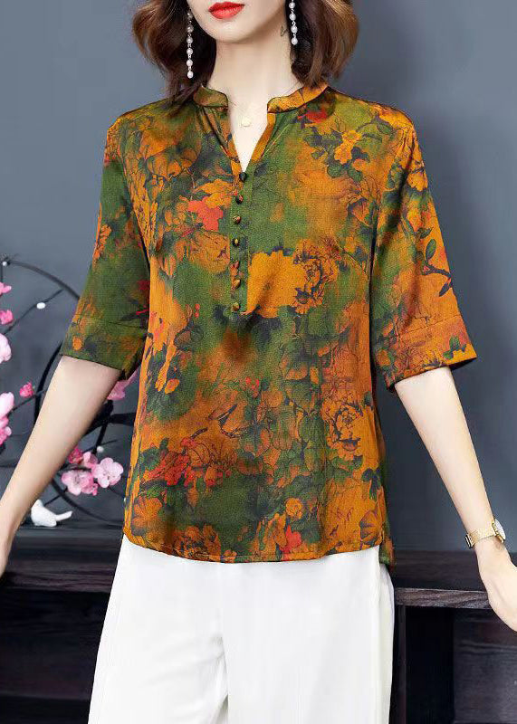 Loose Green V Neck Print Patchwork Silk Tops Summer