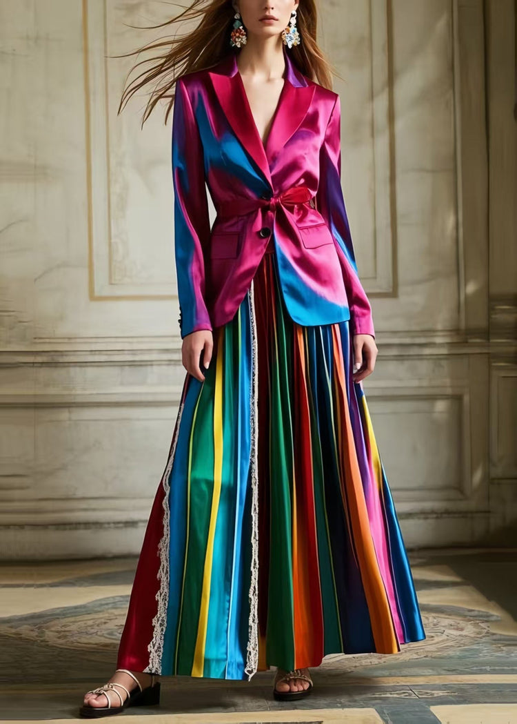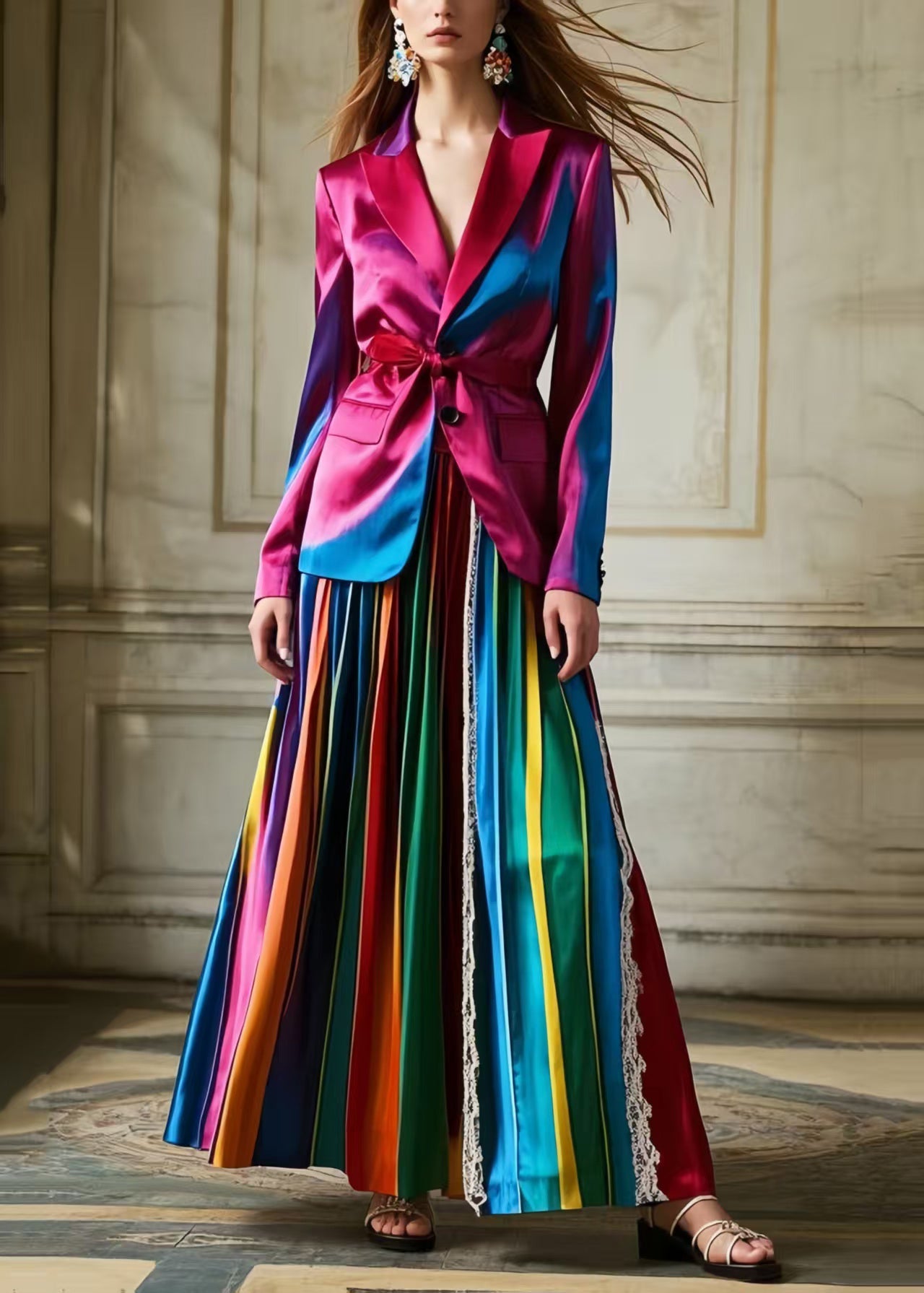 Bohemian Polychrome Striped Patchwork Lace Silk Pleated Skirt Spring