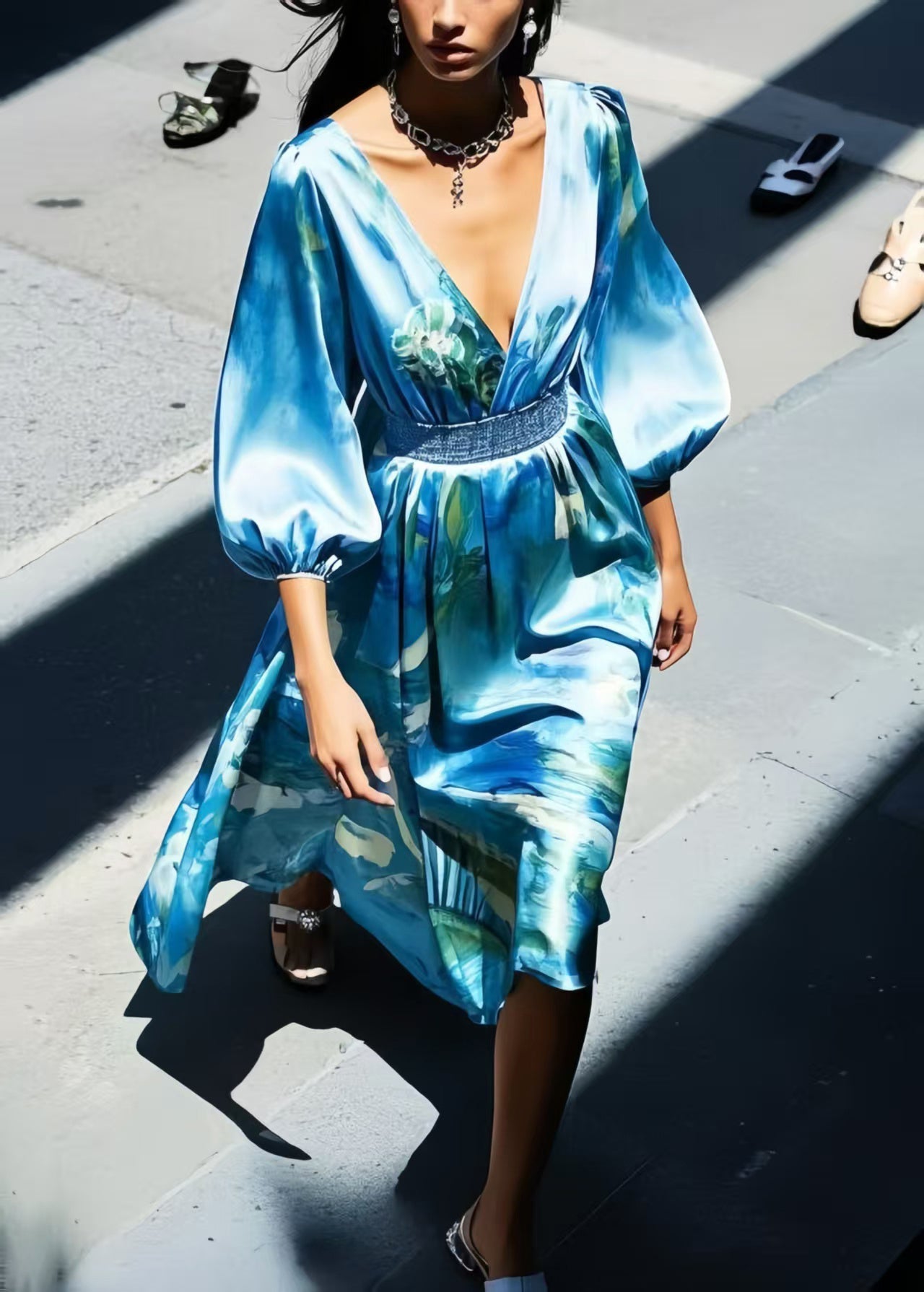 Boho Blue Print Silk Tunic Dress Bracelet Sleeve