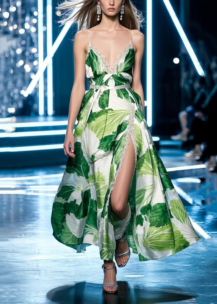 Boho Green Print Side Open Silk Spaghetti Strap Dress Summer