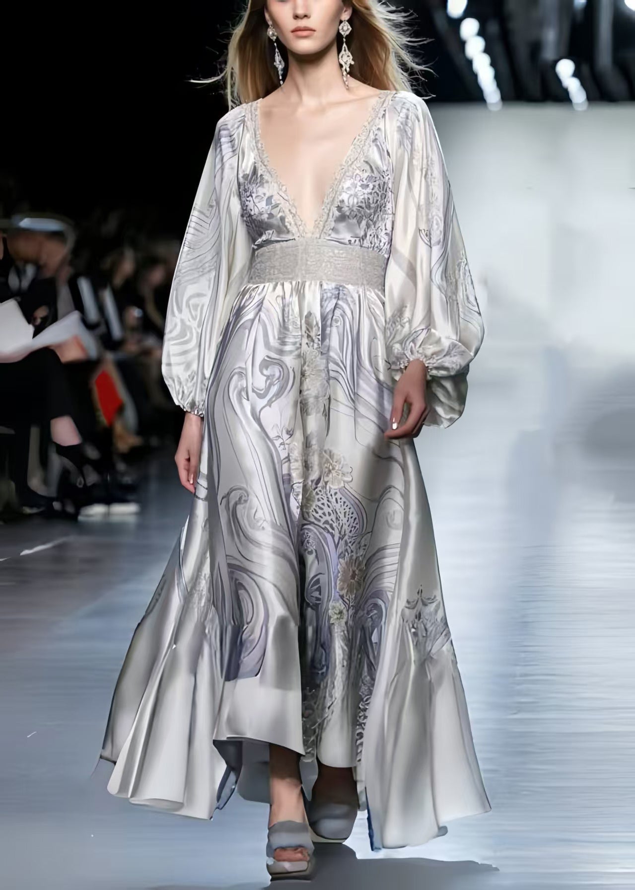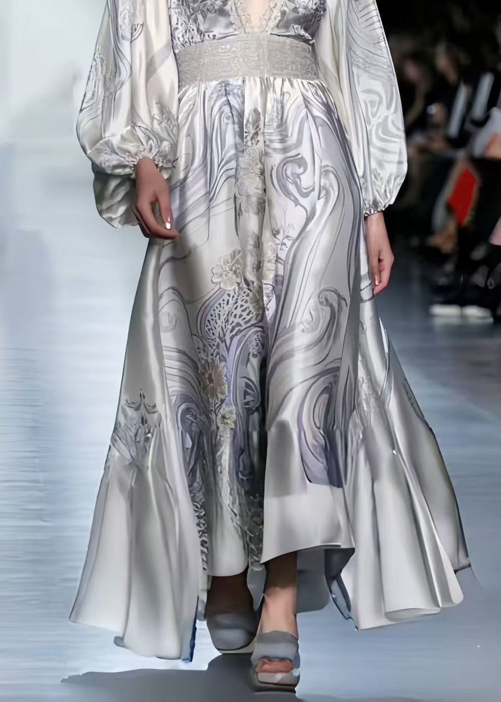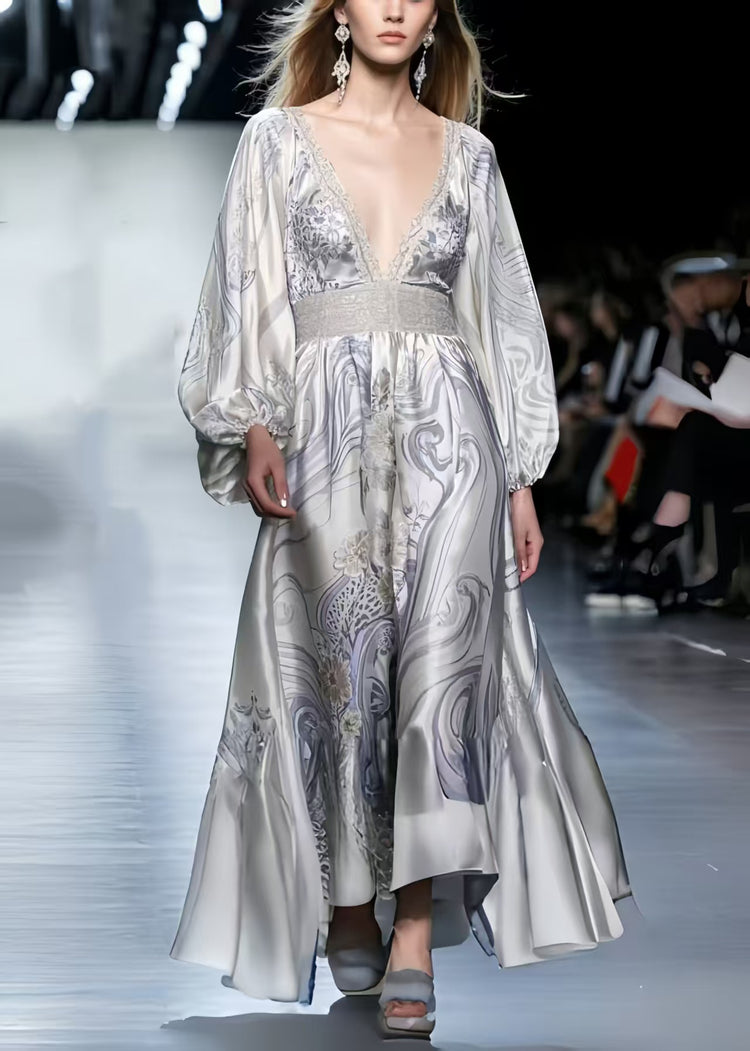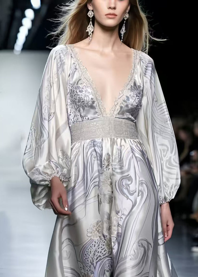 Boutique White V Neck Print Silk Vacation Dress Spring