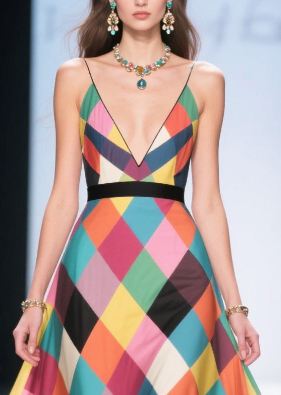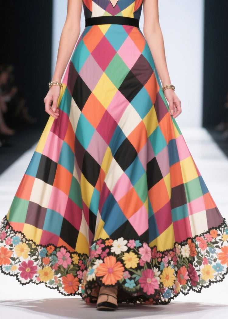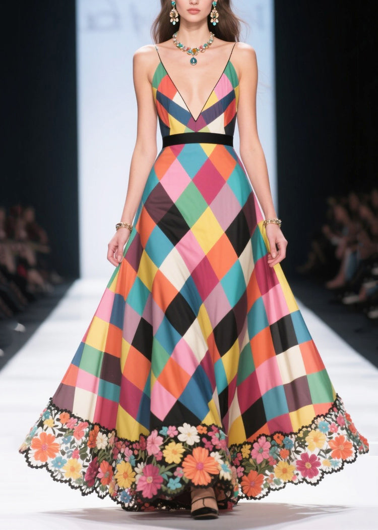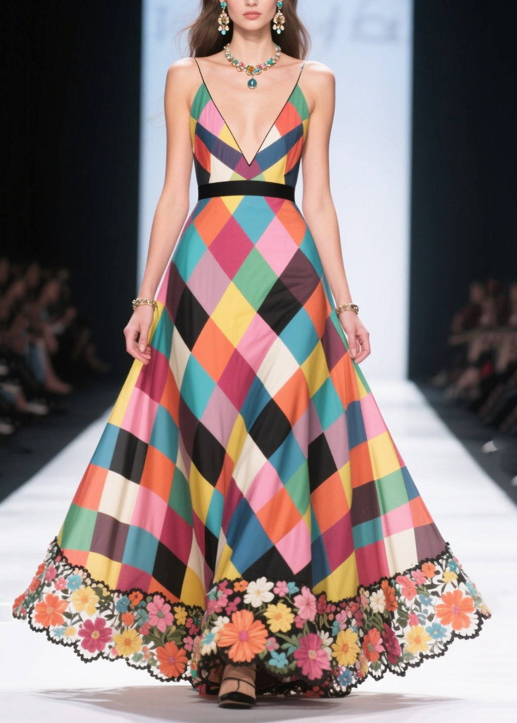 Classy Multicolour Plaid Patchwork Flower Silk Long Dress Summer