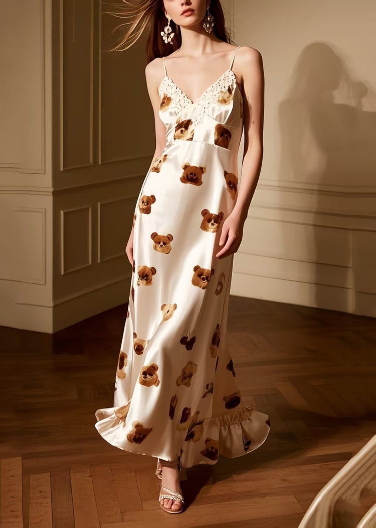 Cute Litter Bear Print Draping Silk Spaghetti Strap Dress Summer