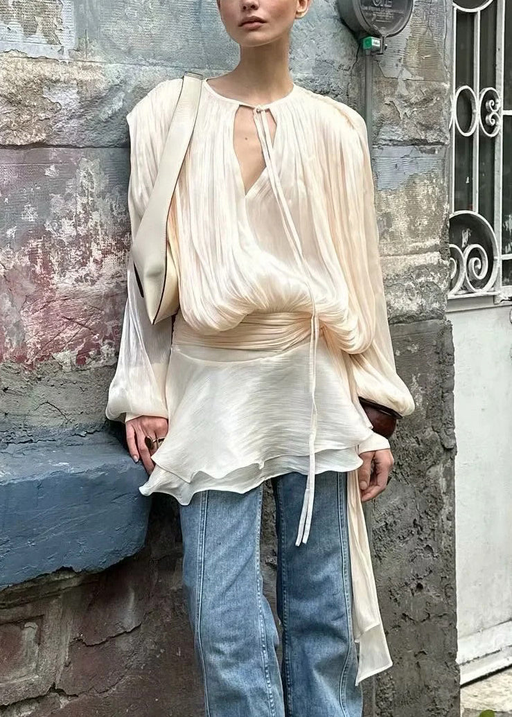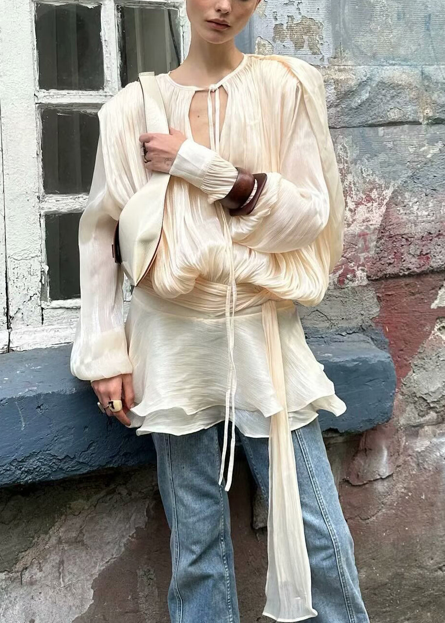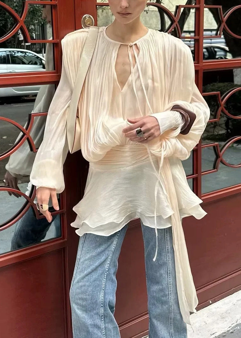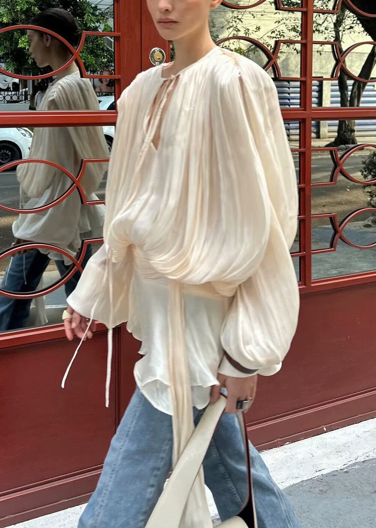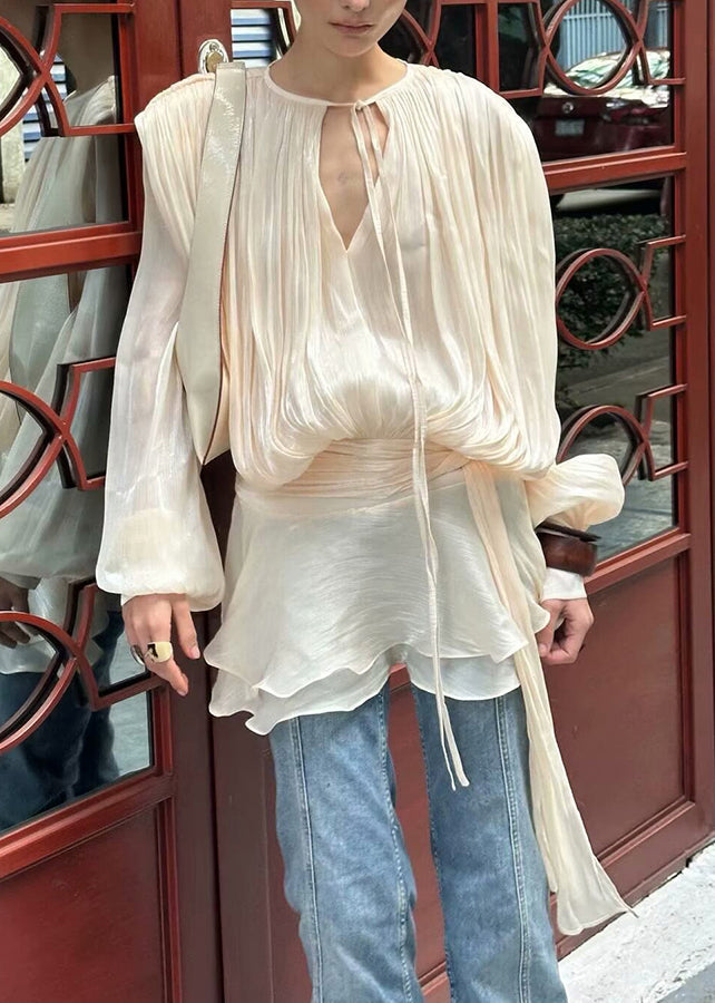 Elegant Champagne Color Wrinkled Lace Up Silk Two Piece Set Fall