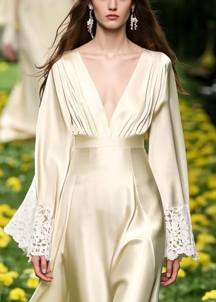 Elegant Champagne Patchwork Lace Draping Silk Long Dresses Spring