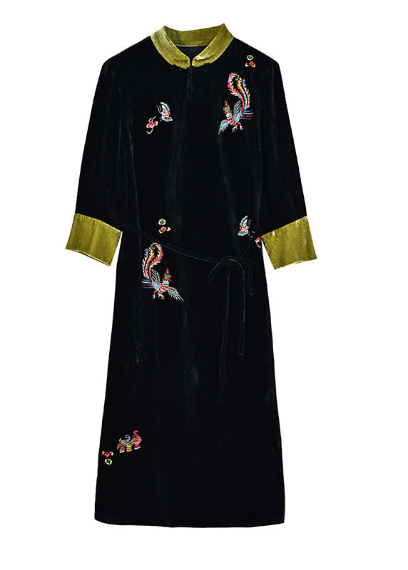 Handmade Black Stand Collar Embroideried Pockets Silk Velour Long Dresses Long Sleeve