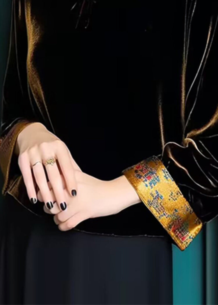 Loose Black Stand Collar Button Silk Velour Top Long Sleeve