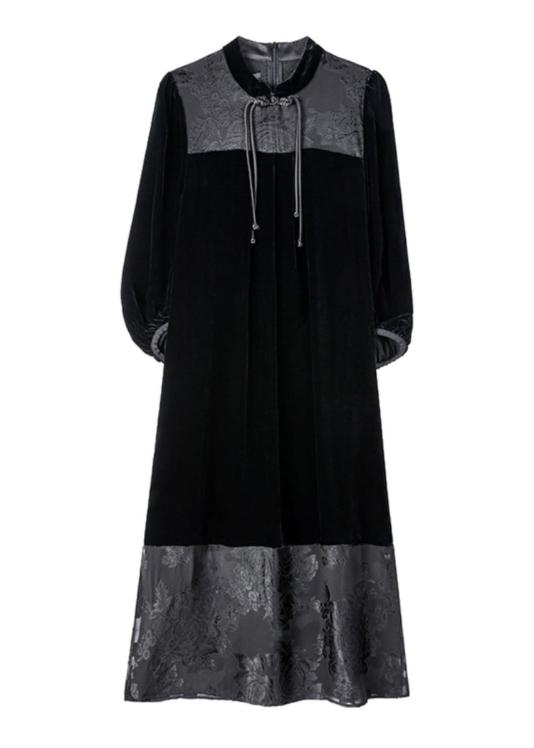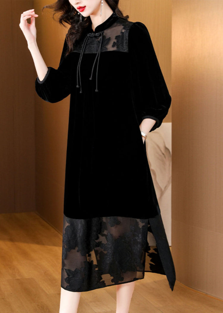 Loose Black Tulle Patchwork Side Open Silk Velour Dress Bracelet Sleeve