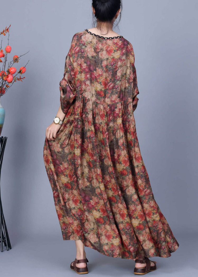 Loose Coffee O Neck Print Wrinkled Silk Long Dress Spring