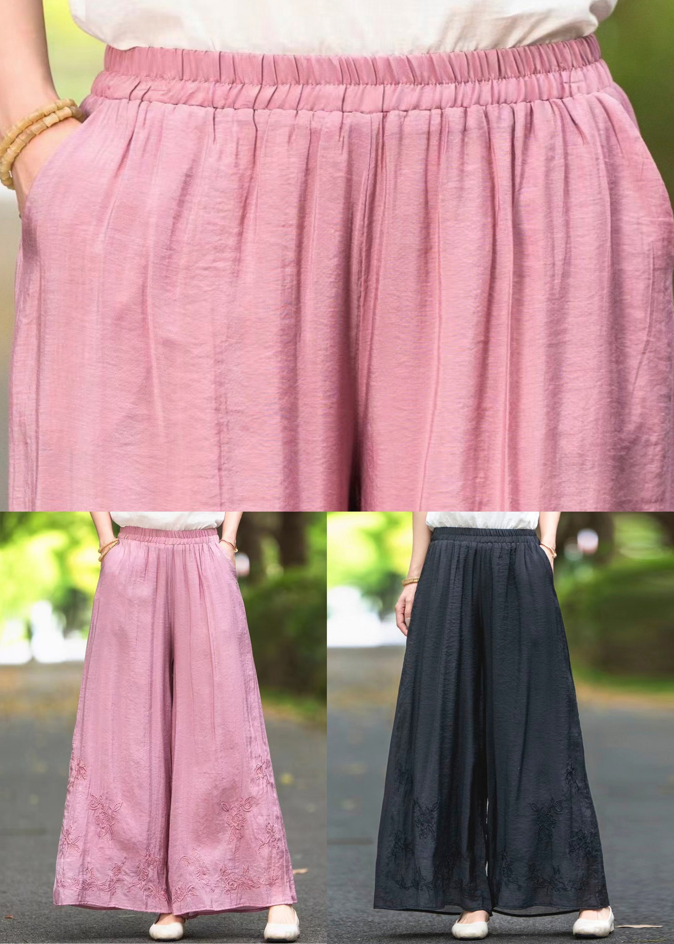 New Pink Embroidered Elastic Waist Silk Wide Leg Pants Summer